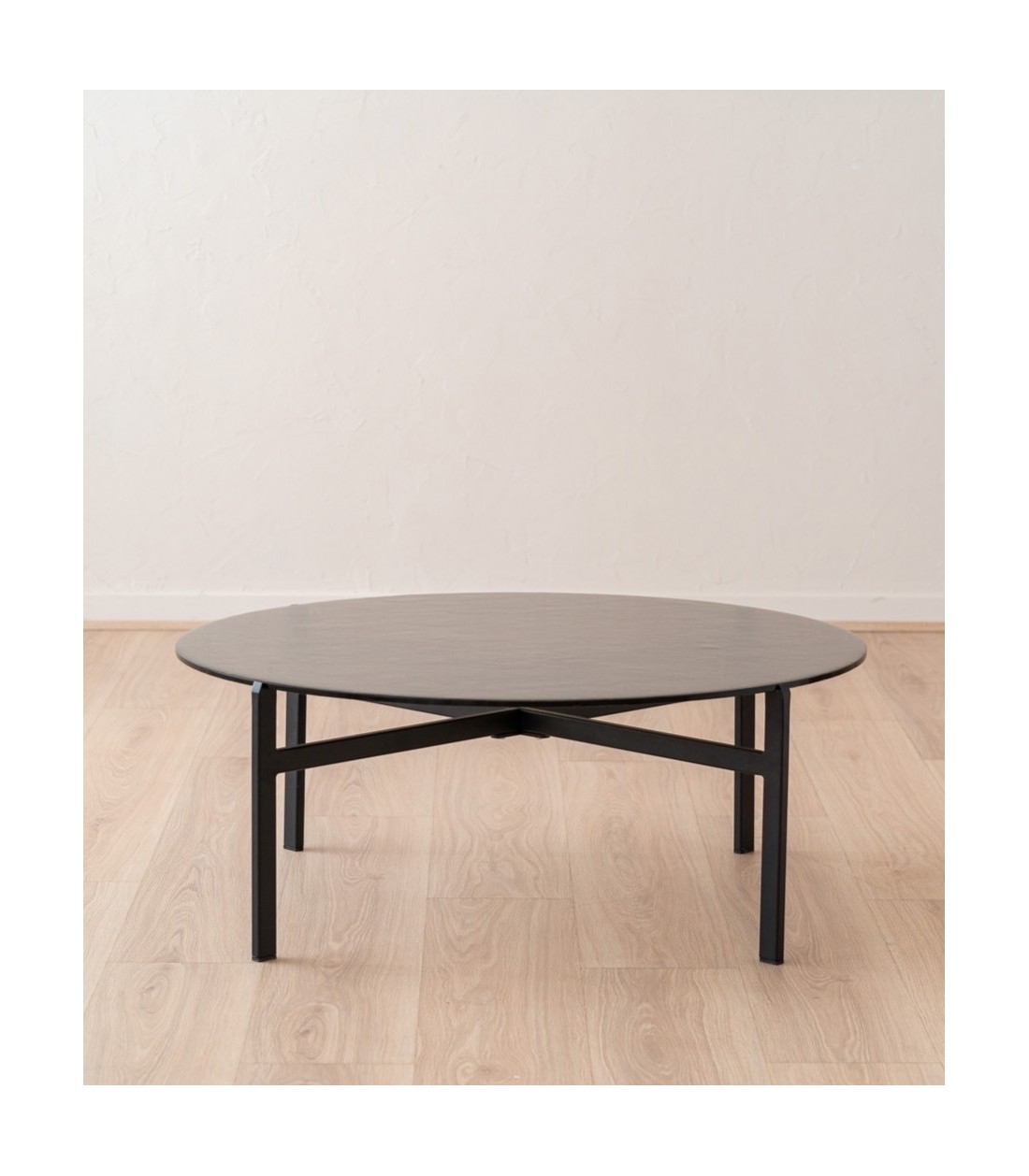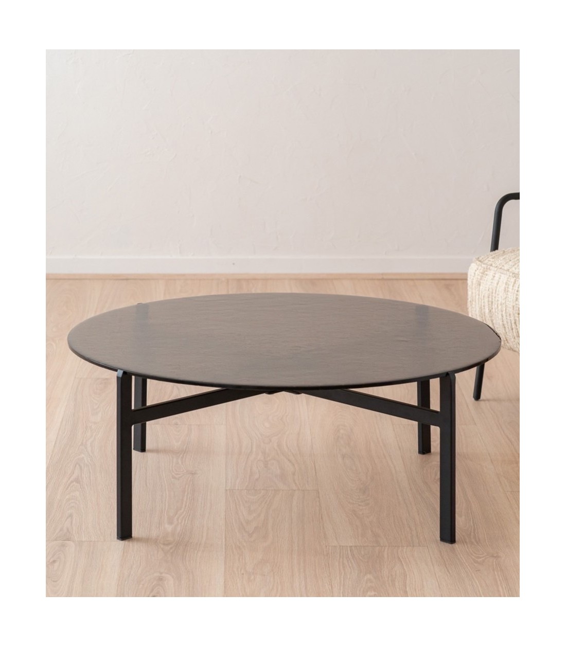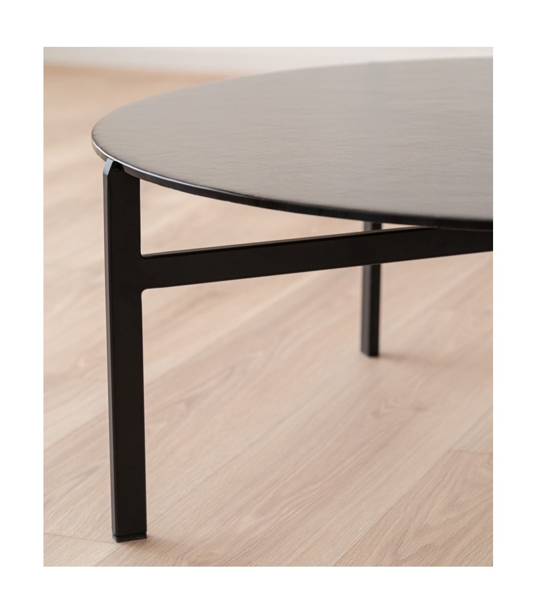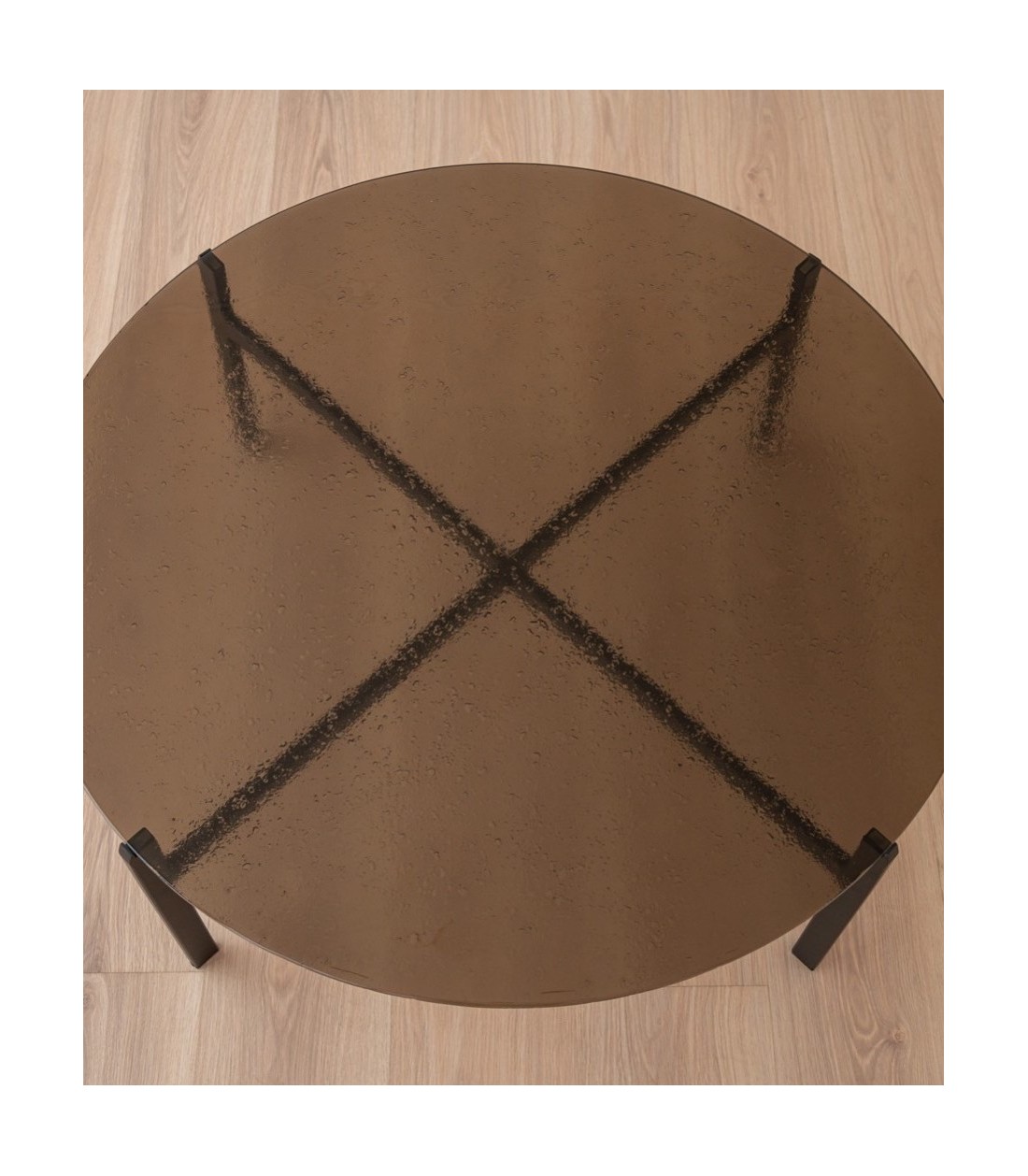 Mesa de centro redonda en vidrio texturizado ámbar con estructura en metal negro mate, de estilo contemporáneo y combinable con distintos interiores.