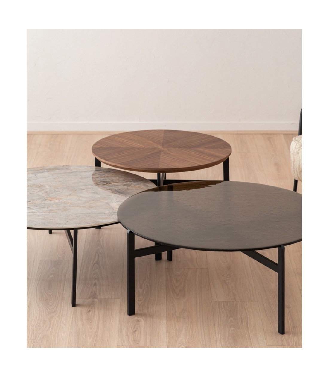 Esta mesa de centro redonda destaca por su sobre de vidrio texturizado en color ámbar, que aporta un aire contemporáneo y elegante, perfecto tanto para interiores minimalistas y naturales como para espacios más sofisticados. Su estructura de metal con acabado negro mate refuerza el diseño estilizado y versátil, capaz de integrarse con facilidad en diferentes estilos de decoración. La combinación de materiales crea un equilibrio visual atractivo, especialmente al complementarse con tapizados y tonalidades neutras. Además, forma parte de un conjunto de tres mesas que mezclan vidrio texturizado, cerámico y nogal, permitiendo crear composiciones dinámicas y armónicas en cualquier salón.