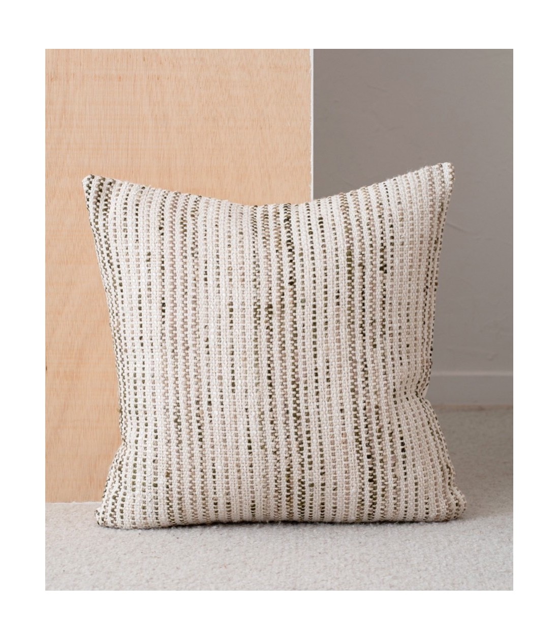Cojín Berte n.º 2 en algodón 100% con diseño de líneas en blanco, verde oliva y beige, relleno de fibra incluido y cierre con cremallera.