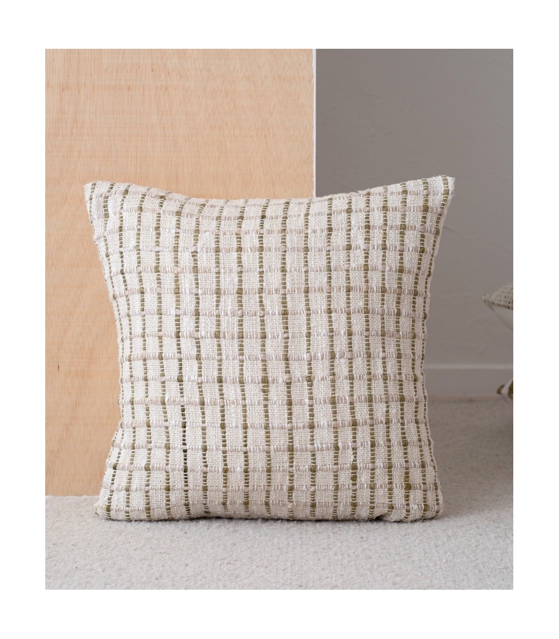 Cojín Berte n.º 4 en algodón 100% con diseño en cuadrícula en blanco, verde y beige, textura entramada, relleno incluido y cierre con cremallera.