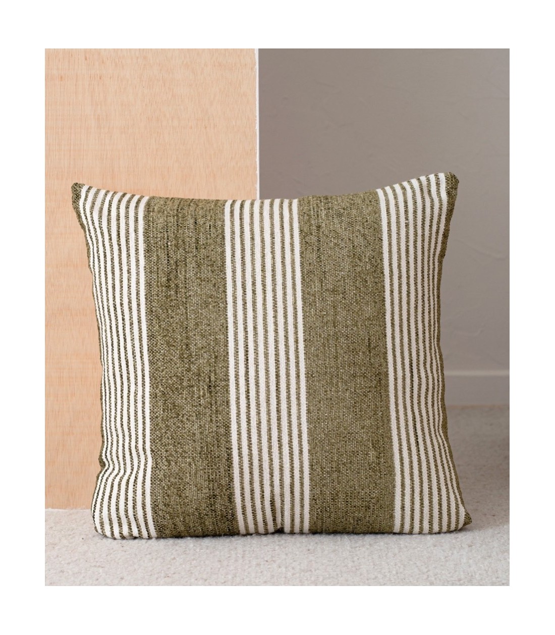 Cojín Berte n.º 5 en algodón 100% con franjas en verde oliva y líneas en blanco y verde, diseño fresco con textura, relleno incluido y cierre con cremallera.
