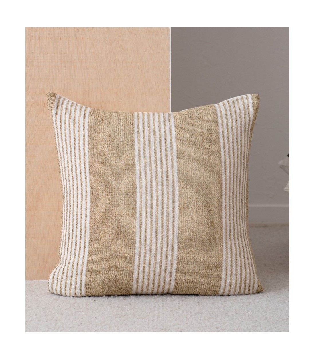 Cojín Ero n.º 3 en algodón 100% con franjas camel y líneas finas en blanco y camel, tejido texturizado con relieve, relleno de fibra incluido y cierre con cremallera.