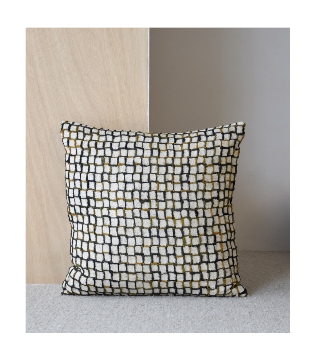El cojín de la colección Laza n.º 4 está confeccionado en algodón 100% y destaca por su funda con entramado de red en tonos ocres y mostaza que resalta sobre un fondo en blanco roto, aportando textura y calidez al ambiente. Incluye relleno de fibra que garantiza comodidad y volumen, además de un práctico cierre con cremallera en la parte posterior que facilita su limpieza y mantenimiento. Su diseño artesanal y elegante lo convierte en una pieza decorativa versátil, perfecta para dar un toque acogedor y sofisticado a sofás, sillones o camas. Se recomienda limpieza en seco para conservar su calidad y colores.