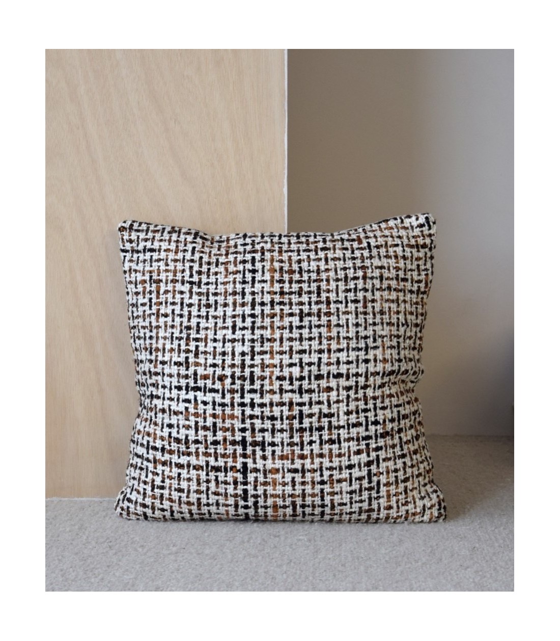 Cojín Laza n.º 5 en algodón 100% con patrón de cuadrícula en tonos mostaza, ocres y toques de negro sobre fondo blanco roto, con relleno incluido y cierre con cremallera.