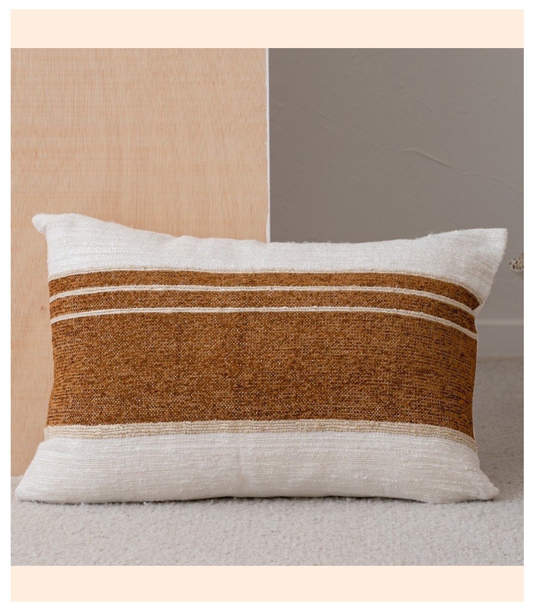 Cojín Minia n.º 4 en algodón 100% con franjas en ocre, líneas en beige y blanco roto, textura con relieve, relleno de fibra incluido y cierre con cremallera.