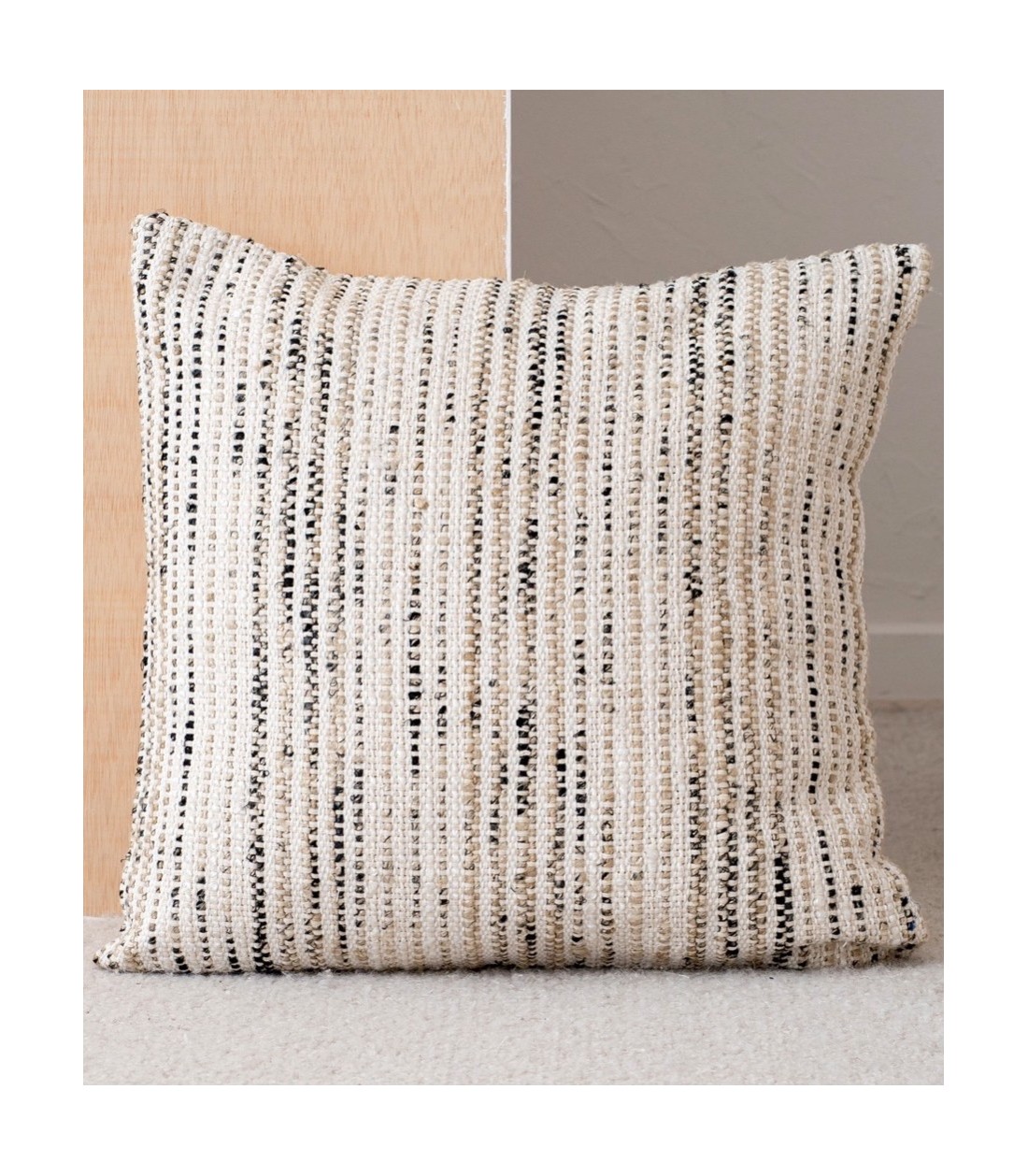 Cojín Oto n.º 2 en algodón 100% con líneas en blanco, negro y beige en entramado texturizado, con relleno incluido y cierre con cremallera.