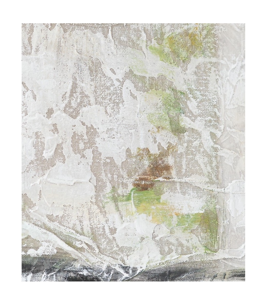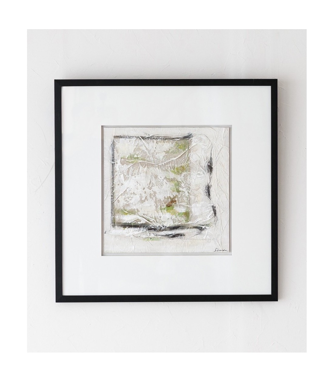 El cuadro Abstracción en Lino N1 es una obra realizada a mano que utiliza una pieza de lino como motivo central, sobre la cual se aplican diversas texturas y se combinan tonos blancos, beige, grises y pinceladas en verde lima, creando profundidad y dinamismo. El paspartú en tono blanco roto y el vidrio protegen y realzan la composición, mientras que el marco en color negro aporta contraste y elegancia. Esta pieza se integra perfectamente en ambientes contemporáneos, minimalistas o modernos, convirtiéndose en un elemento decorativo distintivo que aporta carácter, textura y sofisticación a salones, dormitorios, oficinas o espacios creativos.