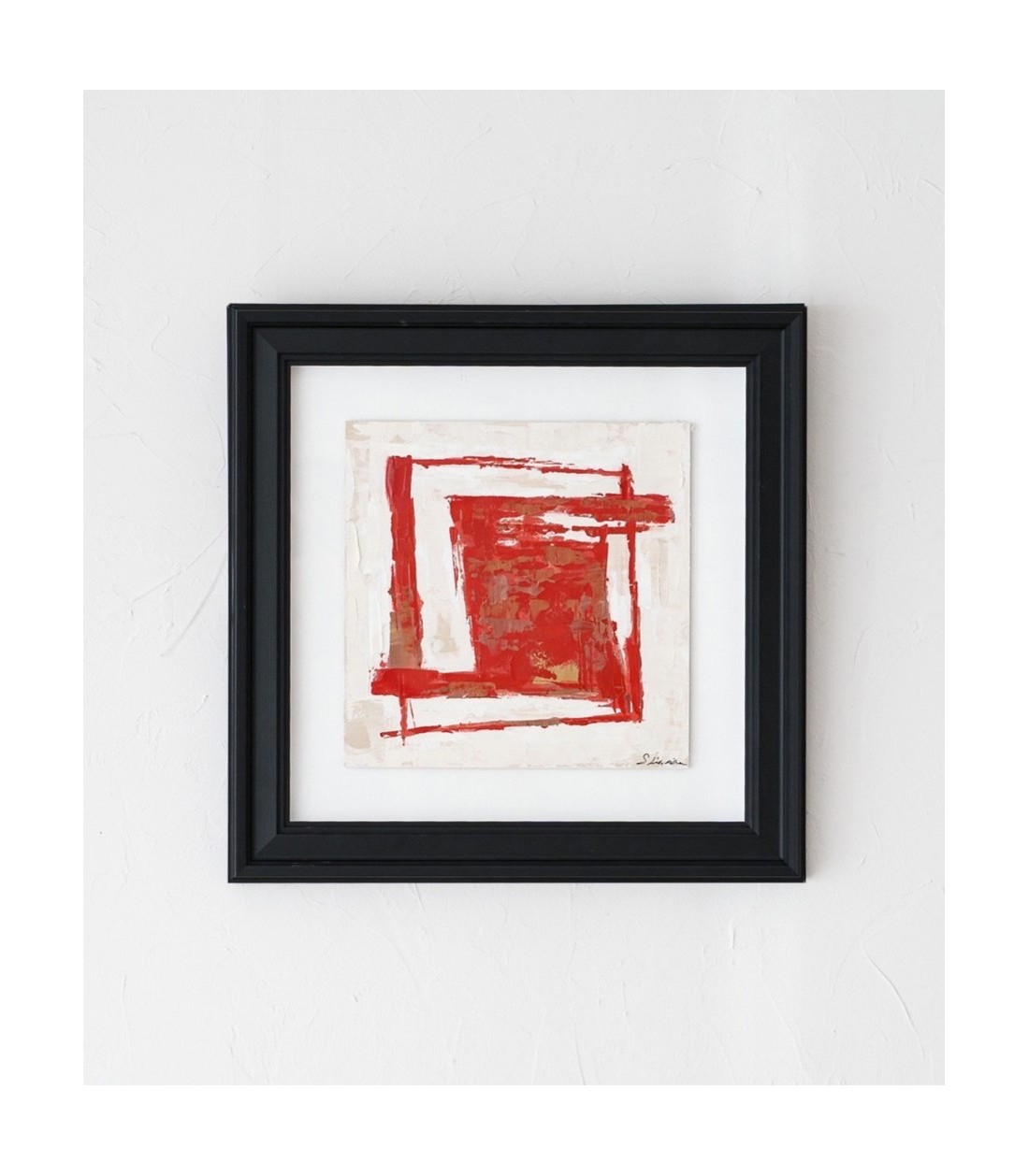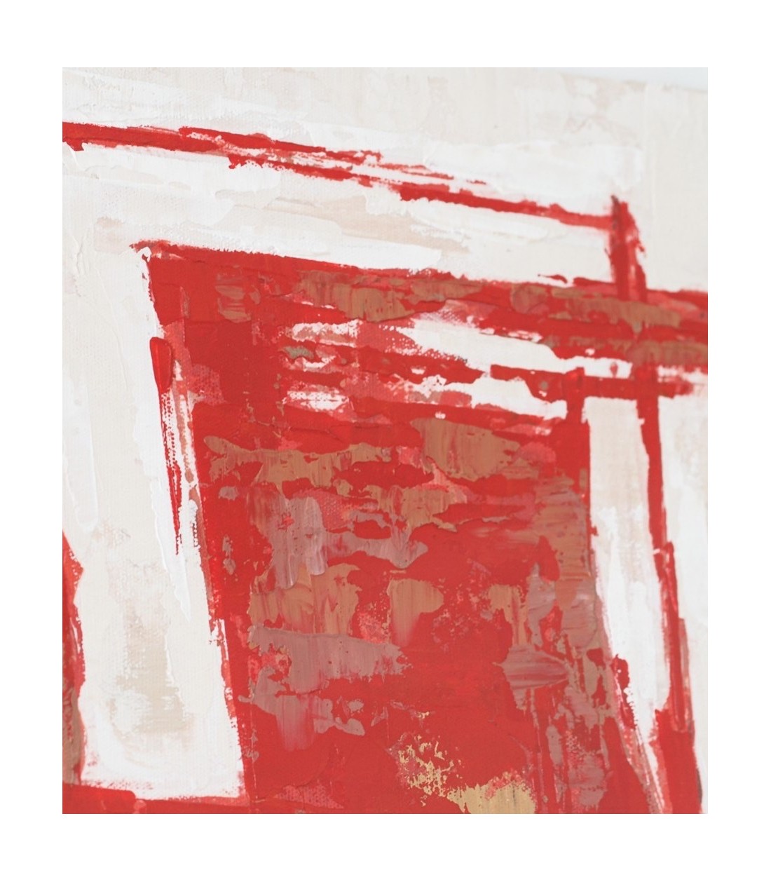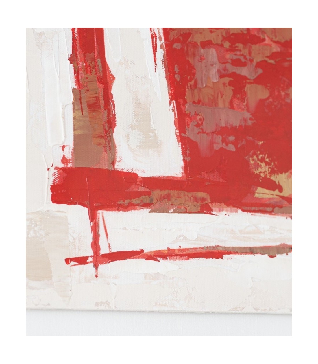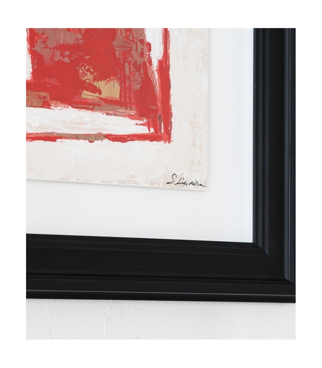 Cuadro Abstracto Rojo, pintura a mano sobre lienzo con una intensa abstracción en tonos rojos sobre fondo blanco y beige, de pincelada gruesa y textura marcada, con relieve y profundidad, enmarcado en negro para un contraste elegante.