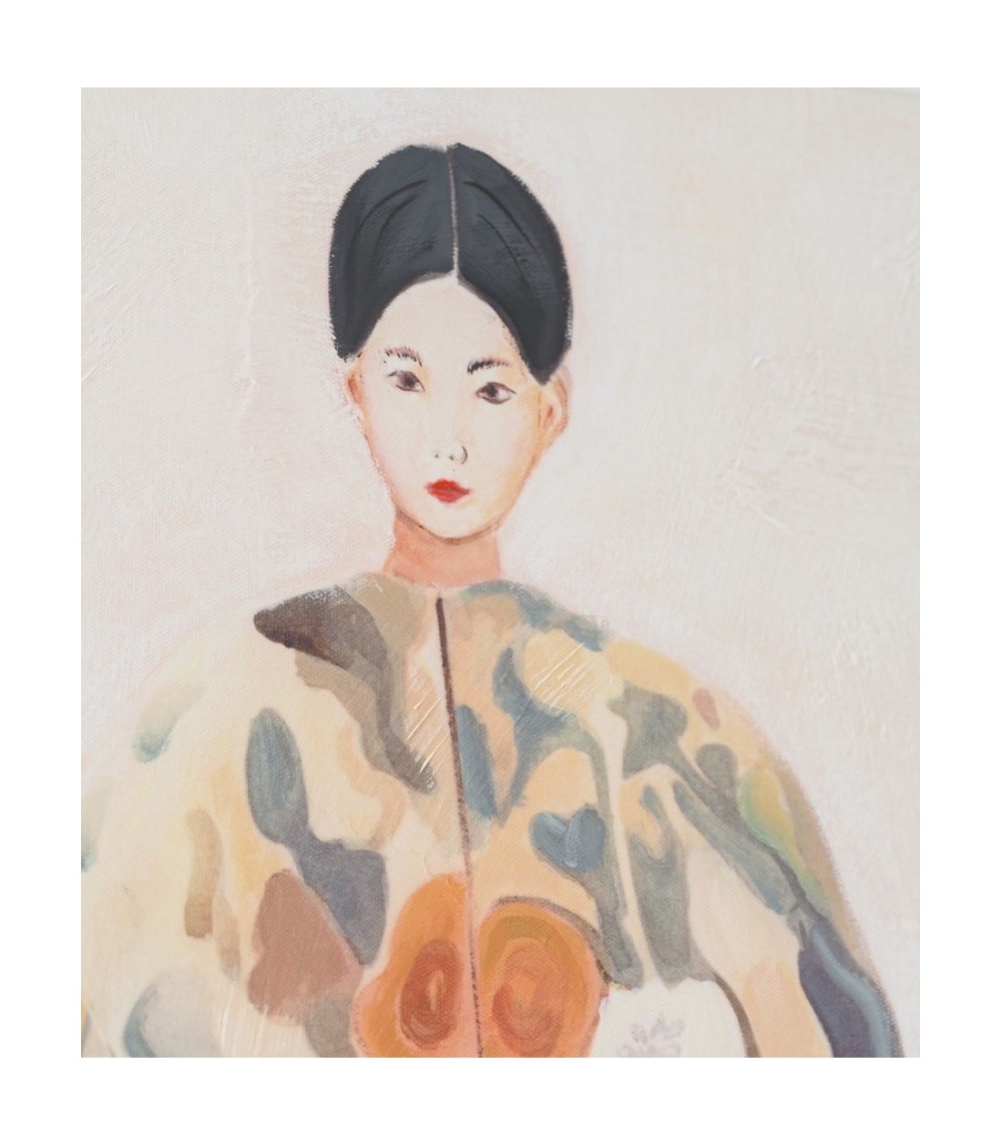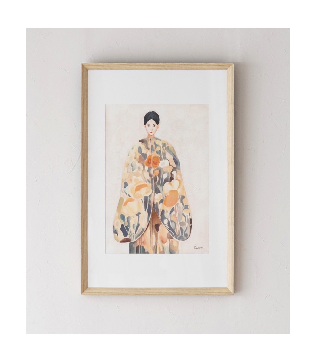 Cuadro Mujer Oriente N4, pintura a mano sobre lienzo con figura femenina de inspiración oriental en tonos ocres, beige y grises, sobre fondo beige texturizado, enmarcado en cristal y madera natural, ideal para aportar serenidad y elegancia.