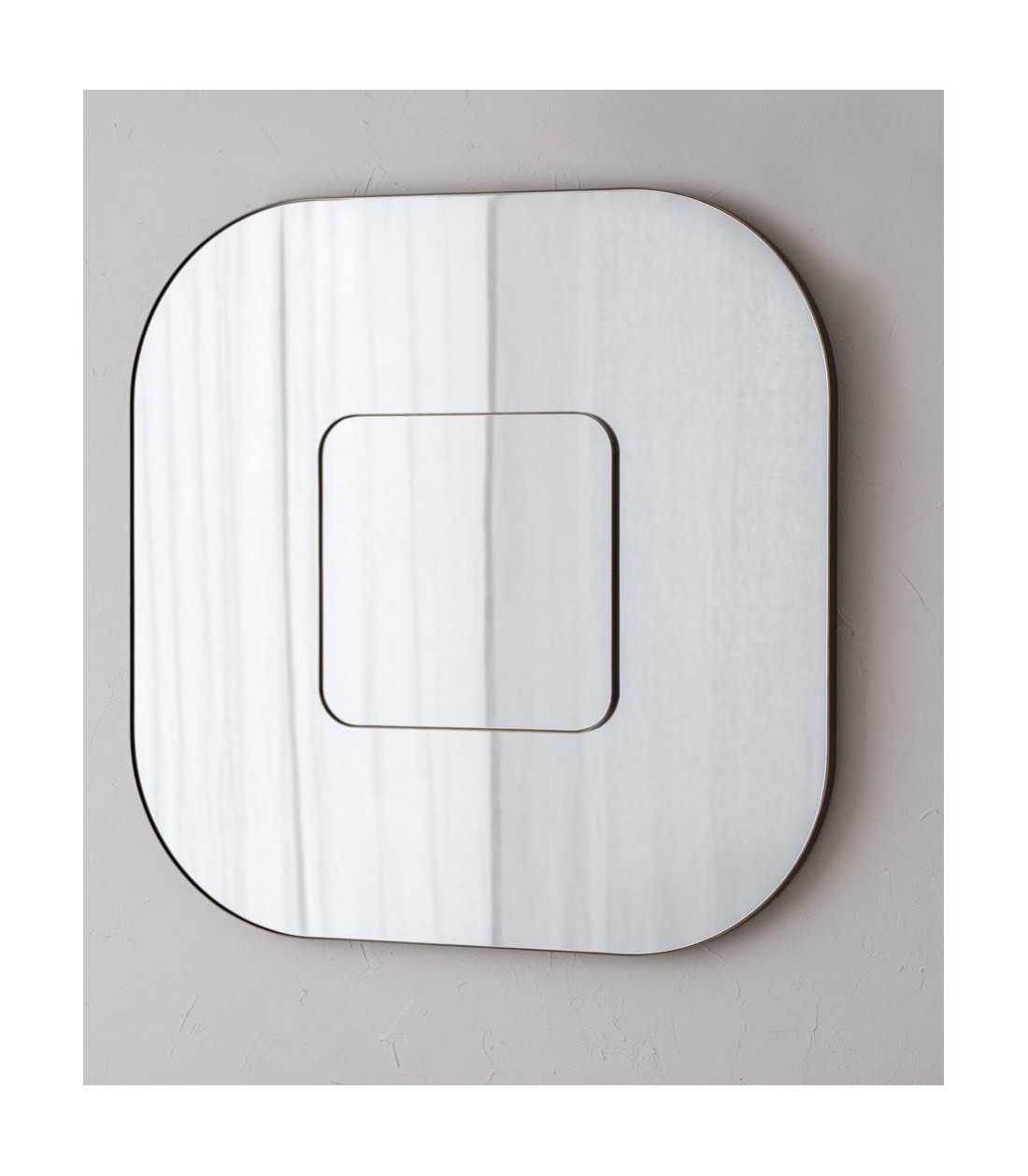 Este espejo de pared se distingue por su composición en dos niveles, que logra un equilibrio visual perfecto y una estética refinada. La base presenta un espejo cuadrado de generosas dimensiones, con bordes suavemente curvados que transmiten fluidez y modernidad. En el centro, un segundo espejo de menor tamaño, con el mismo diseño formal y un marco metálico en acabado oro envejecido, añade un efecto de relieve que aporta profundidad y volumen. Esta estructura doble transforma una pieza funcional en un elemento decorativo con gran personalidad, ideal como punto focal en proyectos de diseño interior, contract o retail. Su presencia elegante y equilibrada convierte cualquier pared en un espacio con carácter y distinción.
