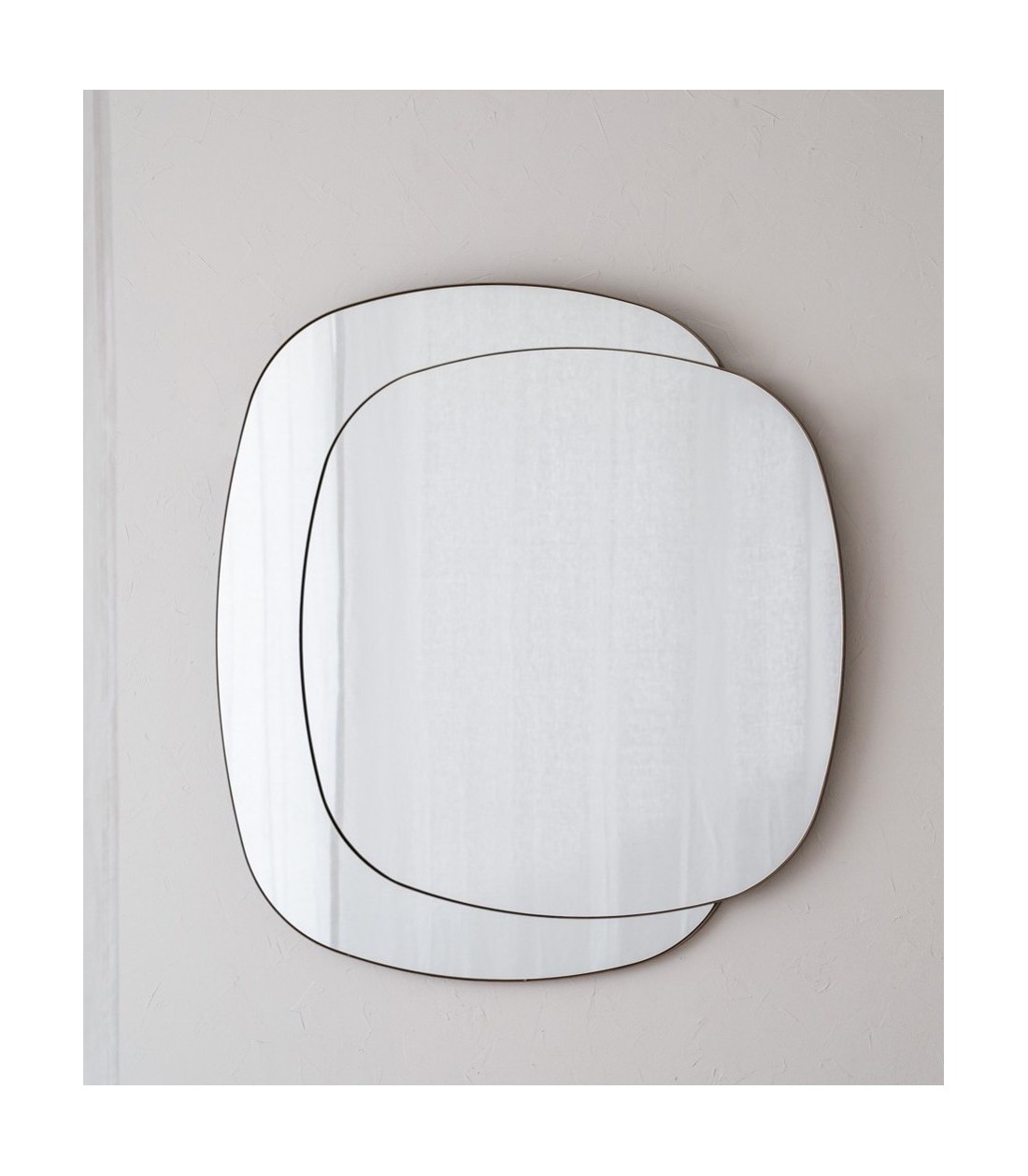 Espejo de pared de diseño contemporáneo y escultural, con doble lámina desplazada, marco metálico en oro envejecido y silueta cuadrada de esquinas redondeadas, ideal para aportar elegancia y personalidad a cualquier espacio.