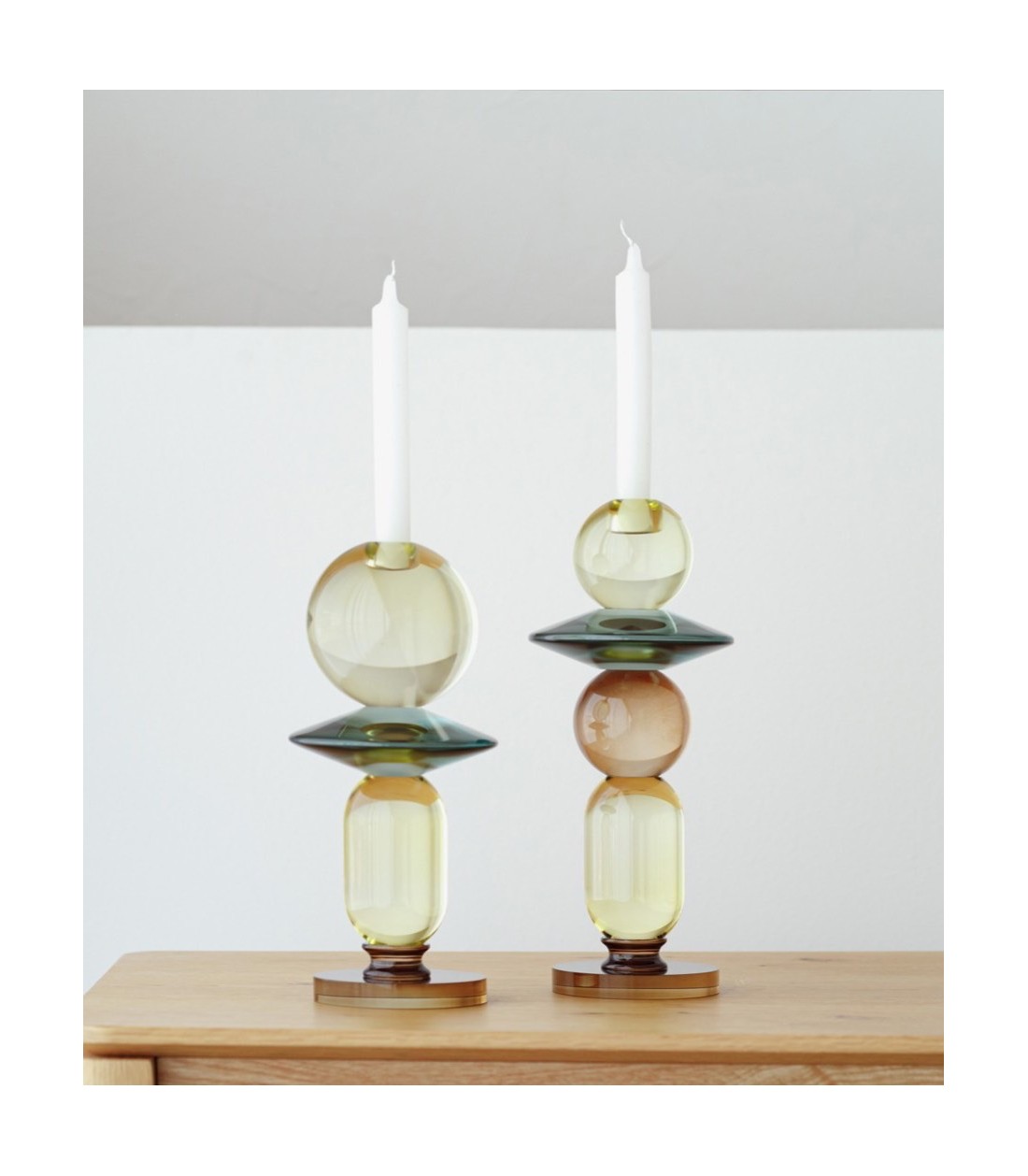 El candelabro Biel está realizado en cristal pulido coloreado, combinando la transparencia del material con vibrantes tonos amarillo ámbar y turquesa distribuidos en sus distintos volúmenes. Esta armoniosa combinación crea un elemento decorativo que llena de luz y color cualquier estancia, aportando un toque elegante y sofisticado. De tamaño alto, la pieza destaca por su presencia y se convierte en un punto focal ideal para salones, comedores o espacios que buscan una decoración luminosa y con carácter. Cada candelabro es único debido a las variaciones naturales del cristal coloreado, lo que aporta exclusividad a la decoración.