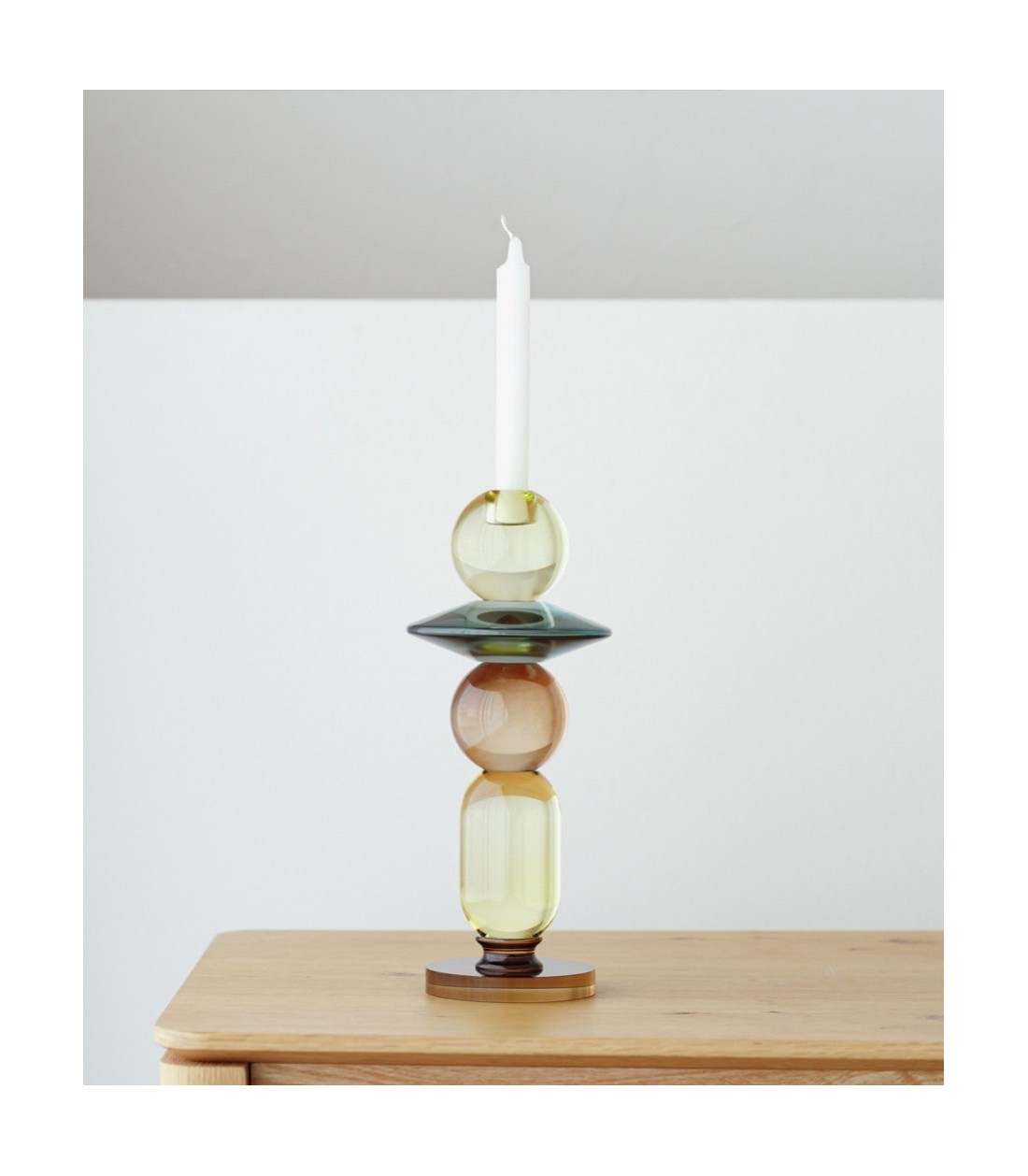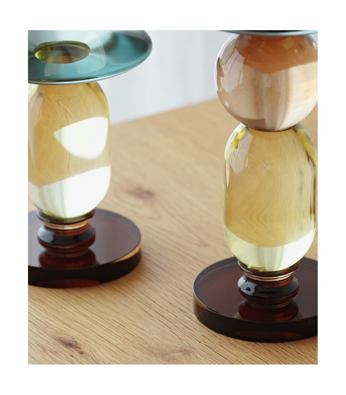 Candelabro Biel en cristal pulido coloreado, con tonos amarillo ámbar y turquesa, de tamaño alto, que aporta luz y elegancia a cualquier estancia.
