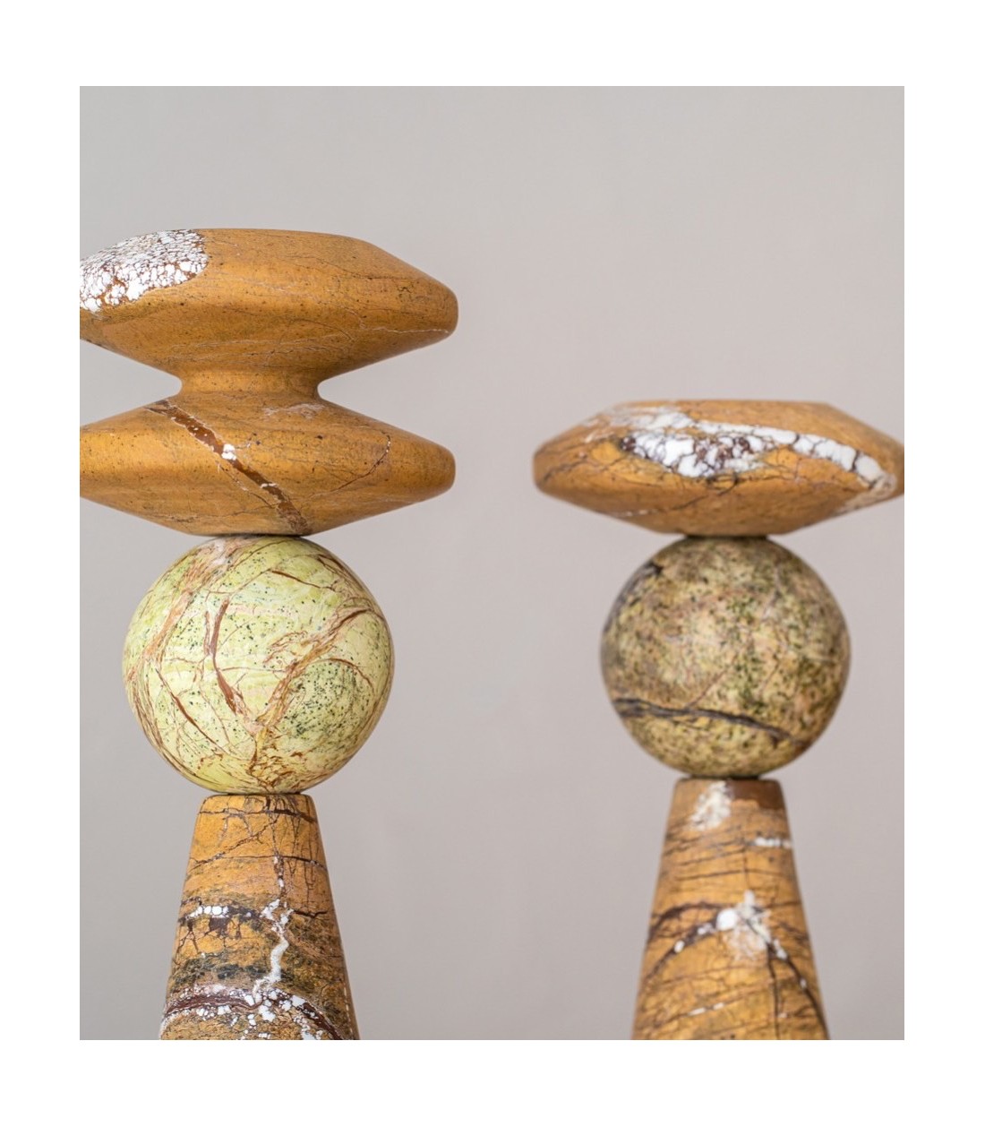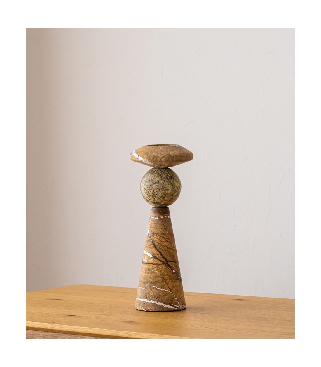 El candelabro Ceibe N2 es una pieza de pequeño tamaño realizada íntegramente en mármol natural. Su diseño se compone de líneas geométricas que transmiten solidez y elegancia: la base y la parte superior están elaboradas en mármol de tonos marrones con vetas en blanco y granate, mientras que la esfera central, en tonos verdes, actúa como nexo visual y estructural entre ambas partes. El contraste de colores y vetas convierte cada pieza en un objeto único, ya que el mármol natural y los acabados artesanales generan variaciones propias como porosidades y matices tonales. Un accesorio decorativo que aporta carácter, nobleza y exclusividad a cualquier ambiente.