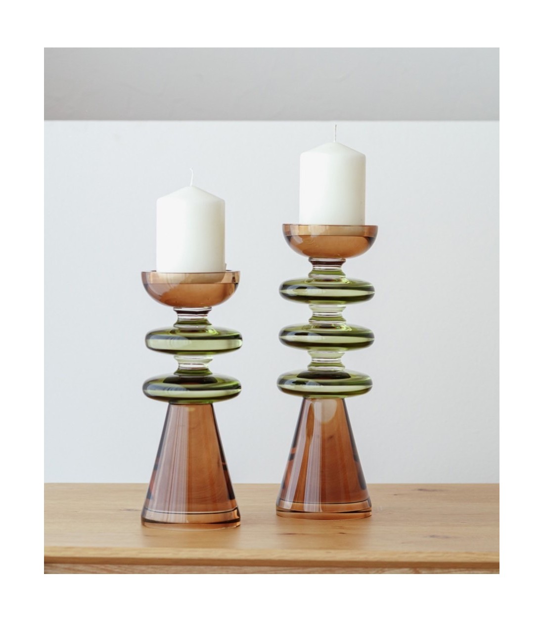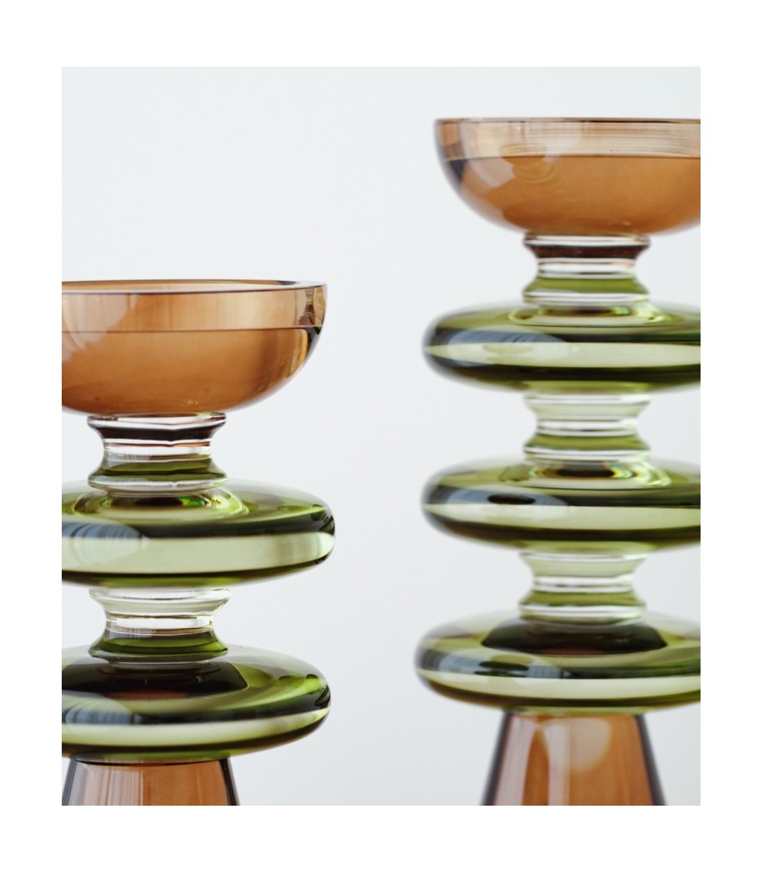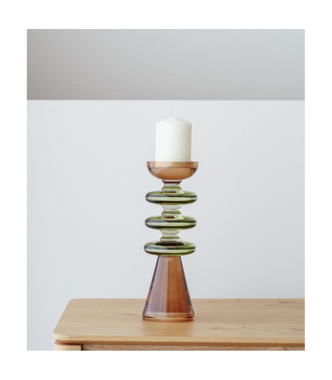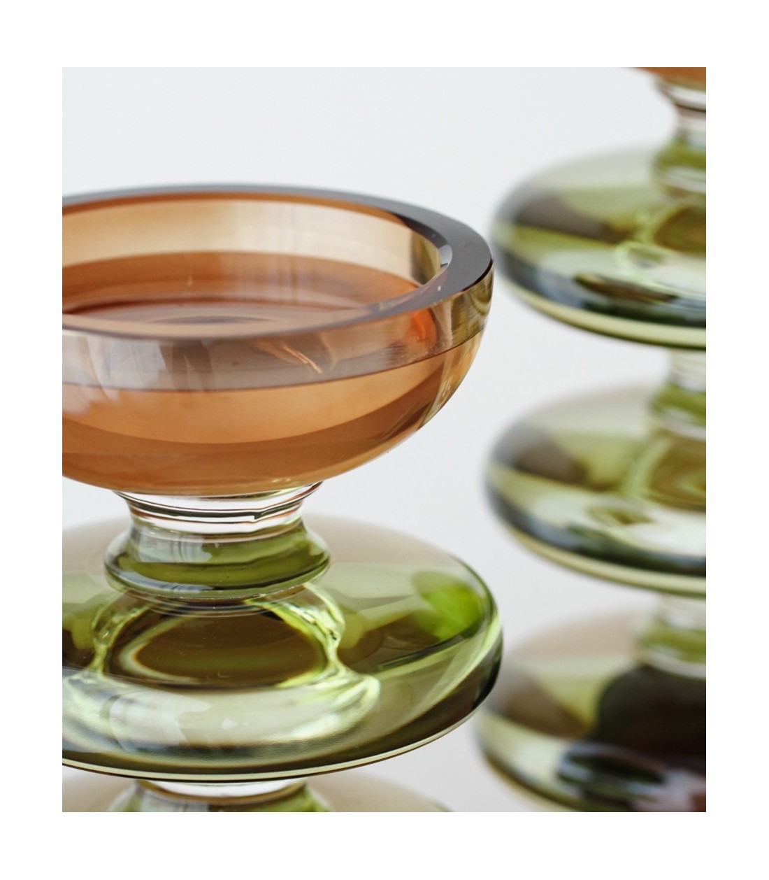 Candelabro EO en cristal pulido coloreado en tonos ámbar y verde, de gran tamaño, que aporta luz y serenidad, ideal para decorar cualquier estancia.