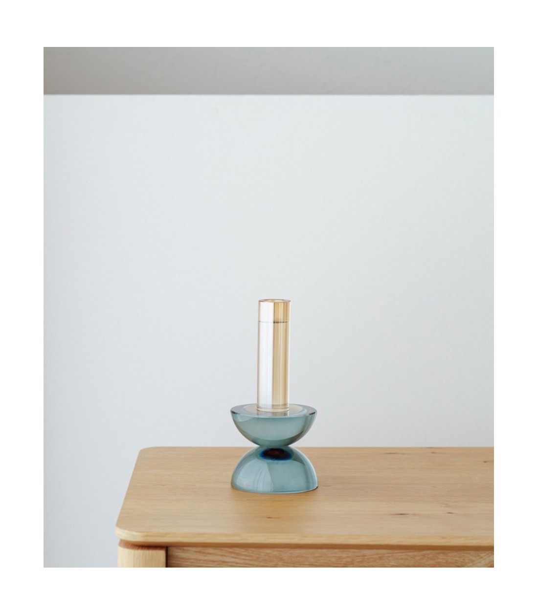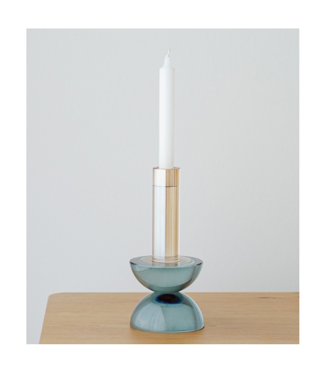 Candelabro Cleo en cristal pulido coloreado que combina base turquesa y parte superior en tono champagne, aportando calidez y elegancia al espacio.