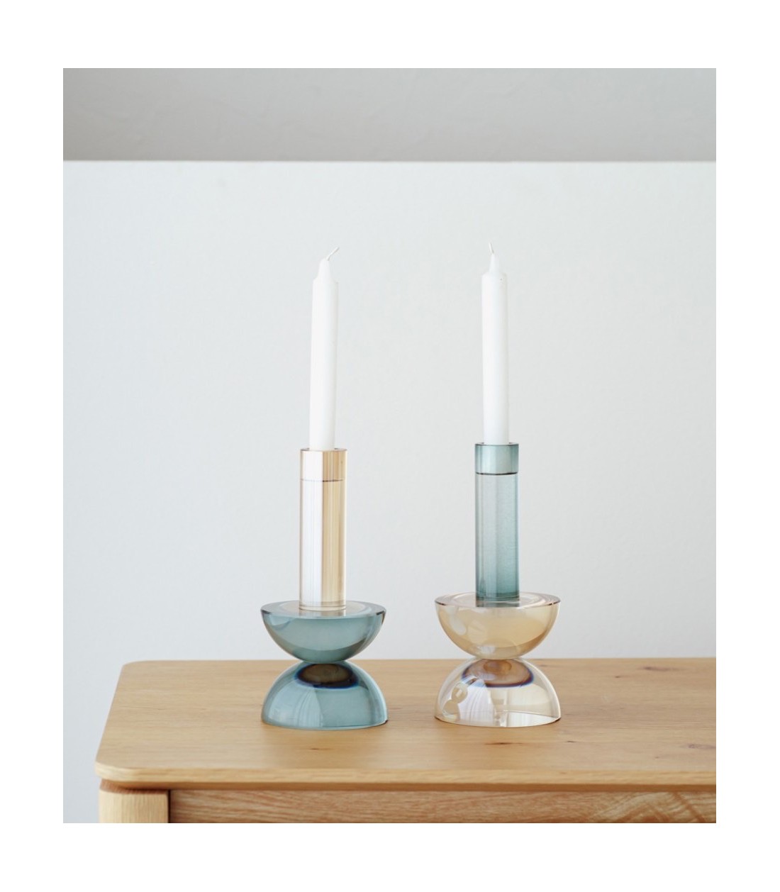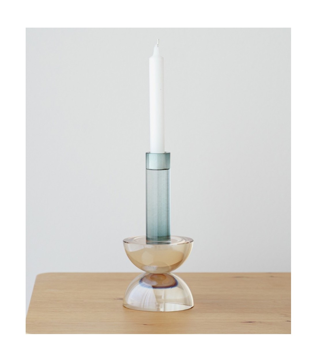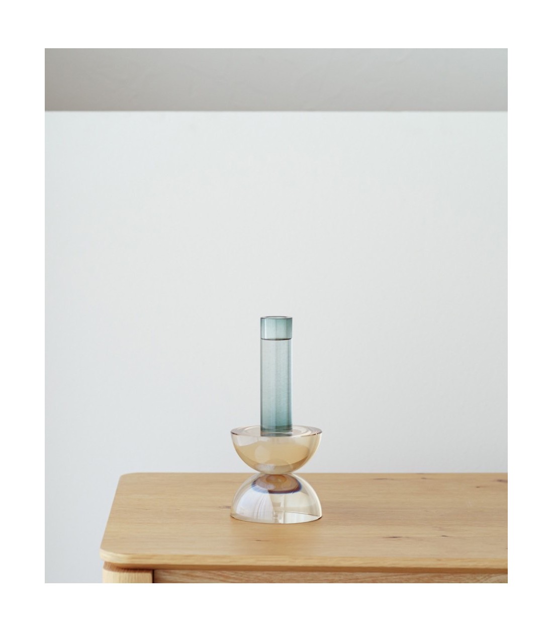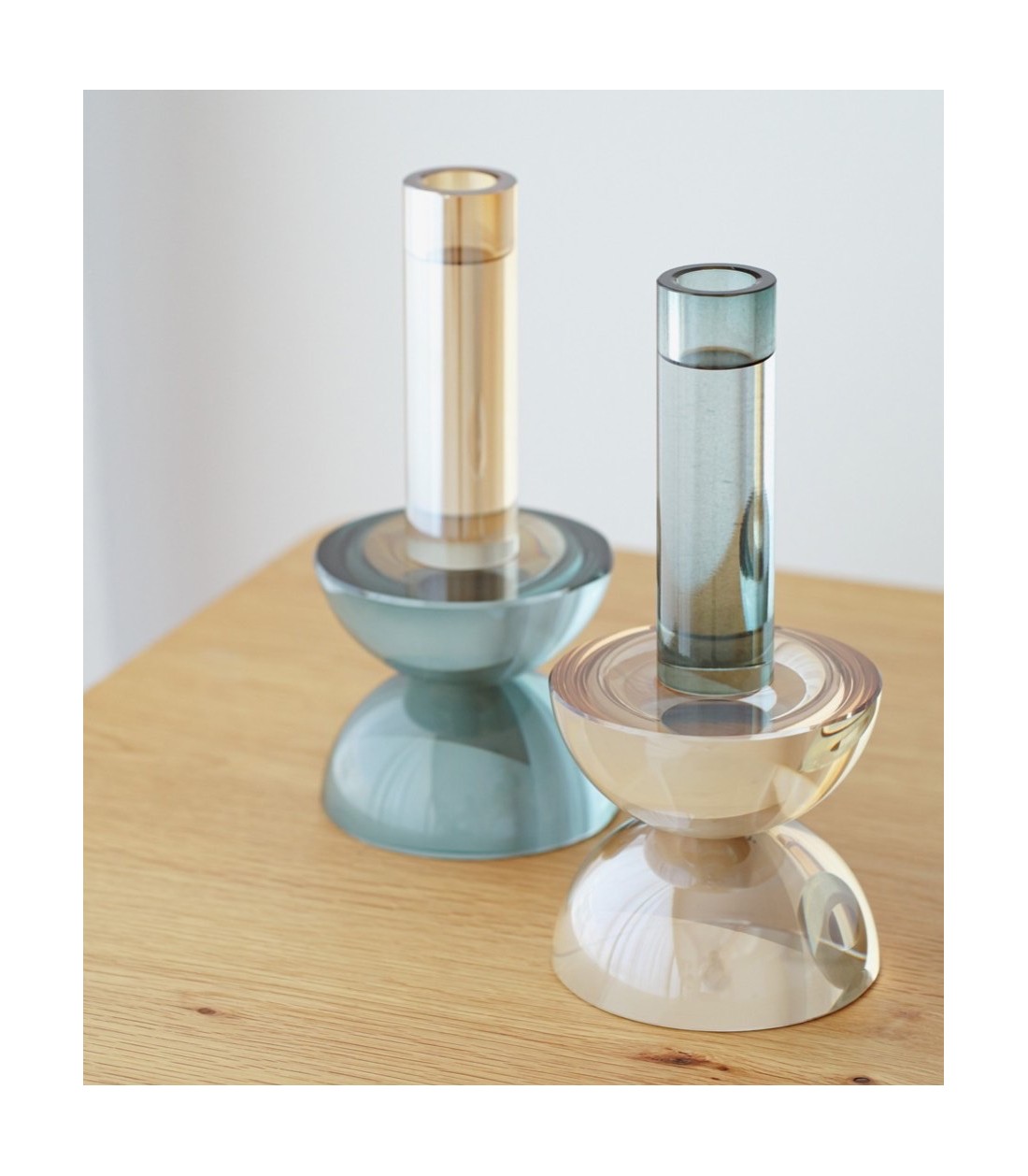 Candelabro Cleo en cristal pulido coloreado que combina base en tono champagne y parte superior en turquesa, aportando calidez y estilo al espacio.