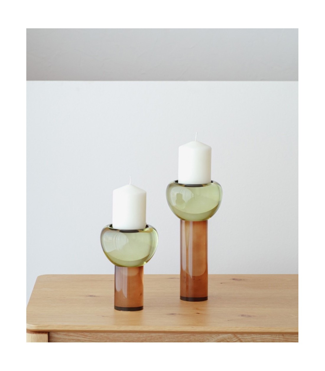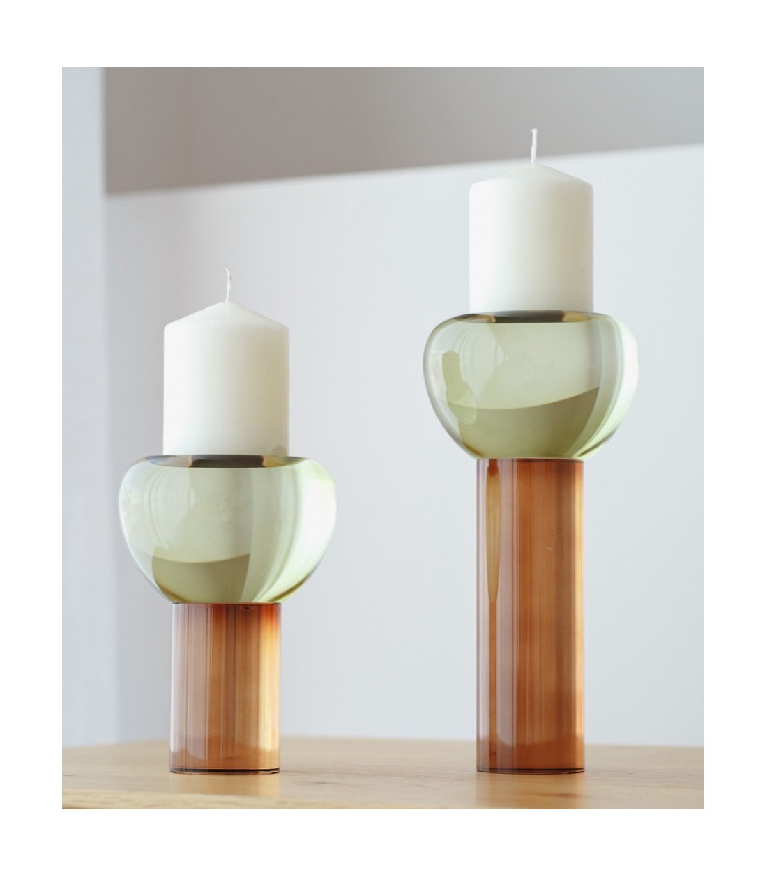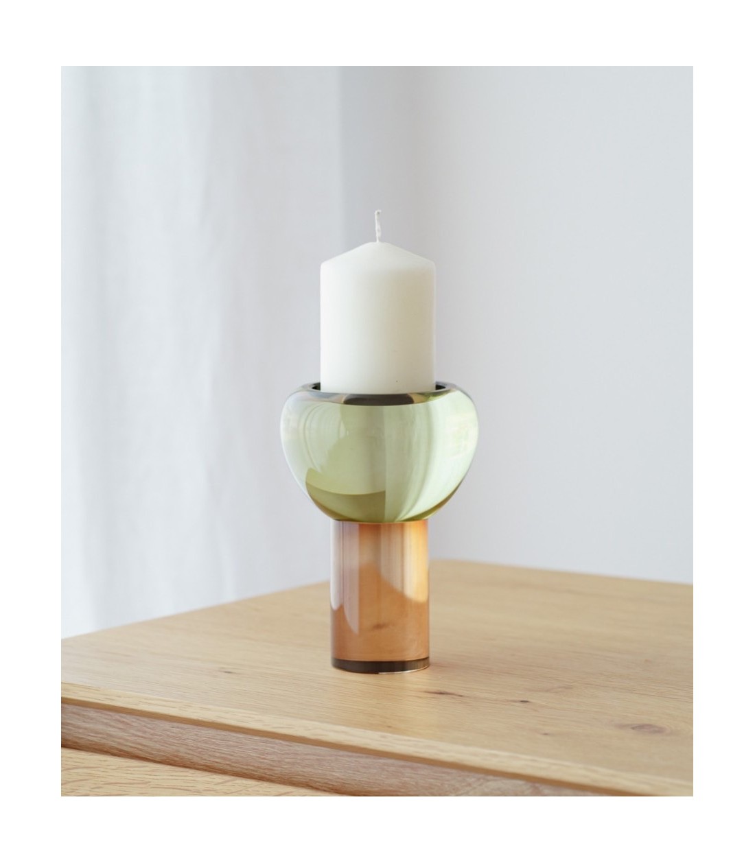 Candelabro Sar en cristal pulido coloreado, de tamaño pequeño, que combina base en tono ámbar y volumen esférico verde, aportando serenidad y luminosidad a cualquier espacio.