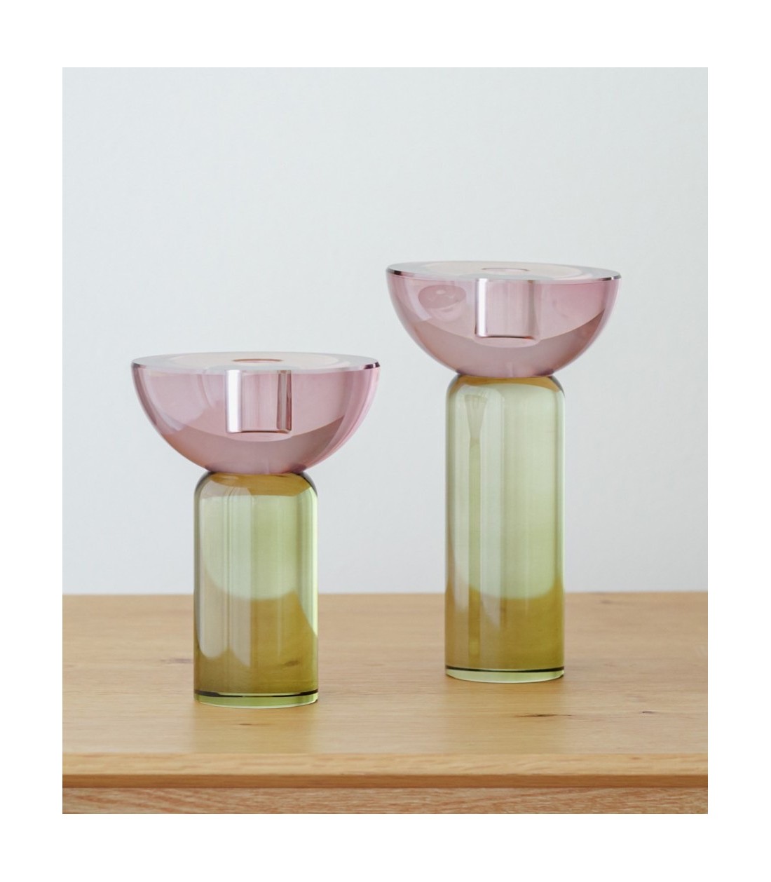 El candelabro Ulla está realizado en cristal pulido coloreado, uniendo el color verde de la base con un suave tono burdeos en la parte superior. Esta combinación de colores crea un elemento decorativo elegante y con carácter, capaz de aportar personalidad a cualquier estancia. De tamaño grande, es ideal para decorar salones, comedores, dormitorios o rincones especiales, aportando luz y sofisticación. Cada pieza presenta variaciones propias del cristal coloreado, lo que garantiza su exclusividad y un toque artesanal único.