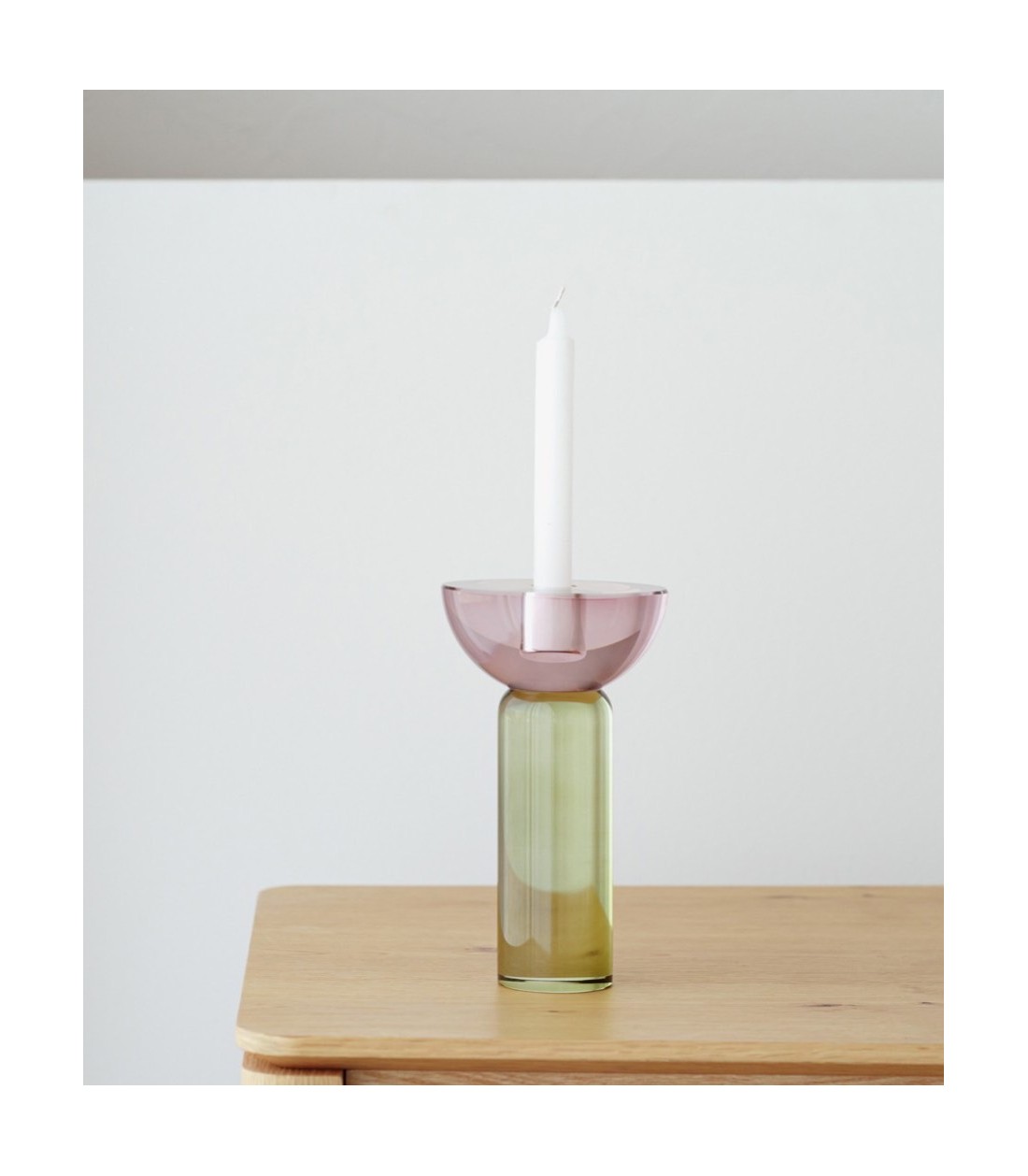 Candelabro Ulla en cristal pulido coloreado, de tamaño grande, que combina base verde y parte superior burdeos, aportando personalidad y estilo a cualquier espacio.