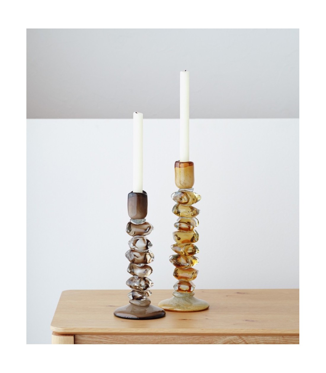 El candelabro Aldán está realizado en vidrio con un elegante tono ámbar, combinado con zonas transparentes que aportan contraste y ligereza al diseño. Su forma irregular favorece un atractivo juego de luces y reflejos, que se intensifica al encender las velas para crear atmósferas cálidas y acogedoras. Perfecto para decorar salones, comedores o rincones íntimos, esta pieza combina funcionalidad y estética, aportando un toque de sofisticación y confort a cualquier espacio.