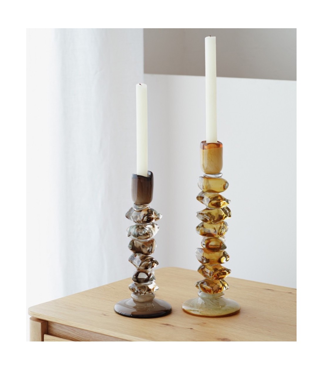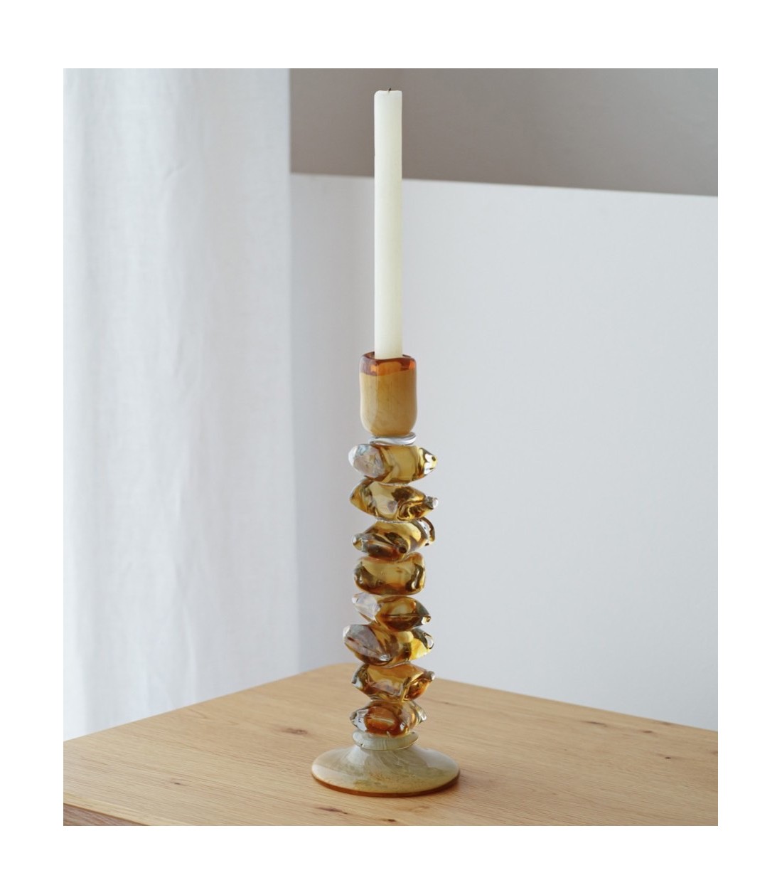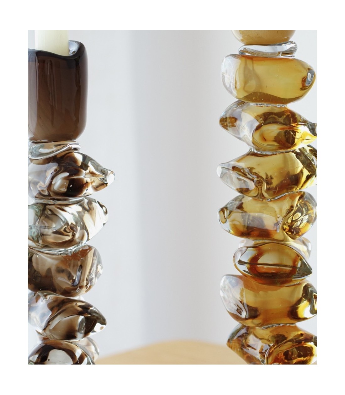 Candelabro Aldán en vidrio de color ámbar con zonas transparentes, de forma irregular, que crea juegos de luces cálidos y acogedores al encender las velas.