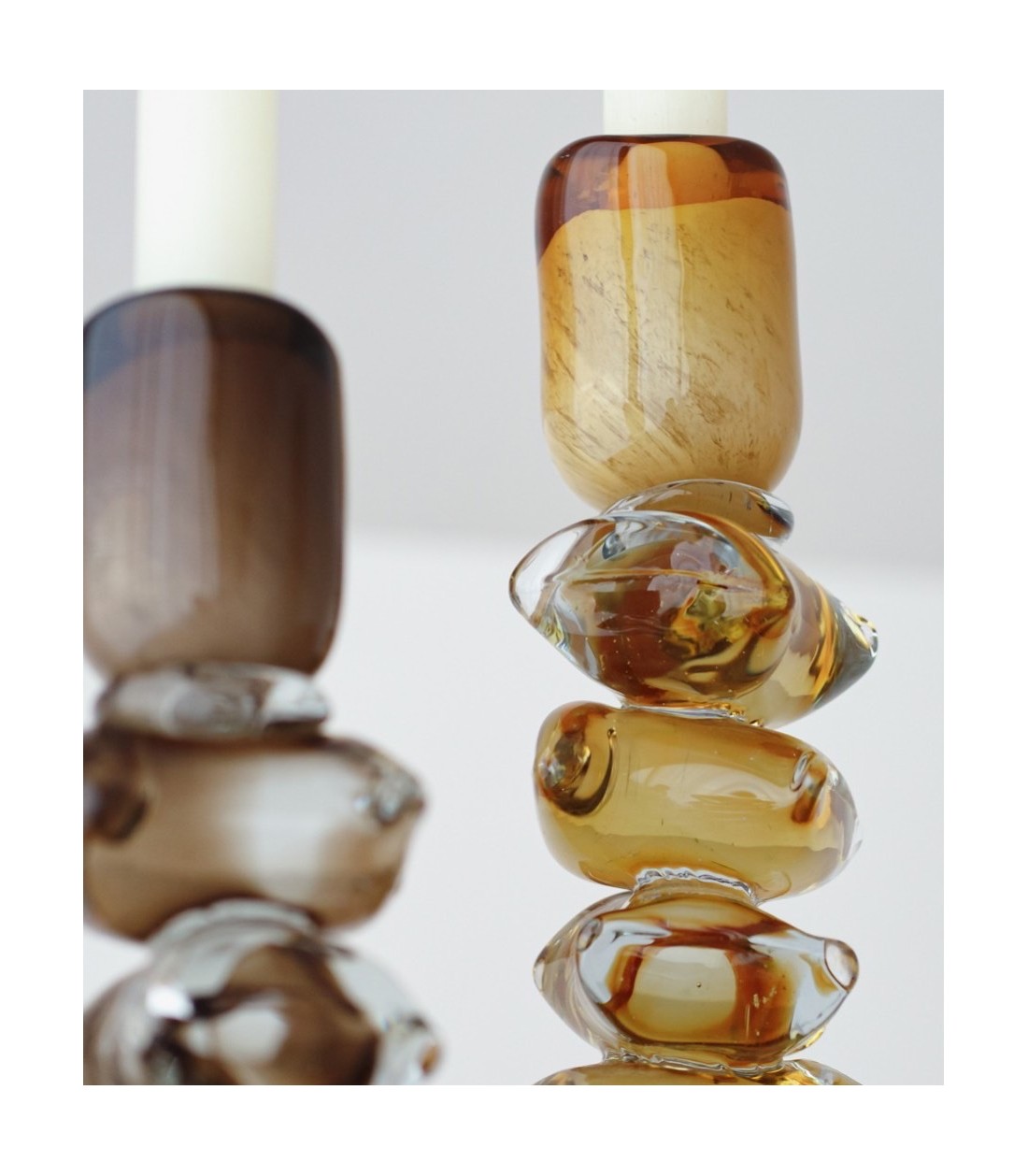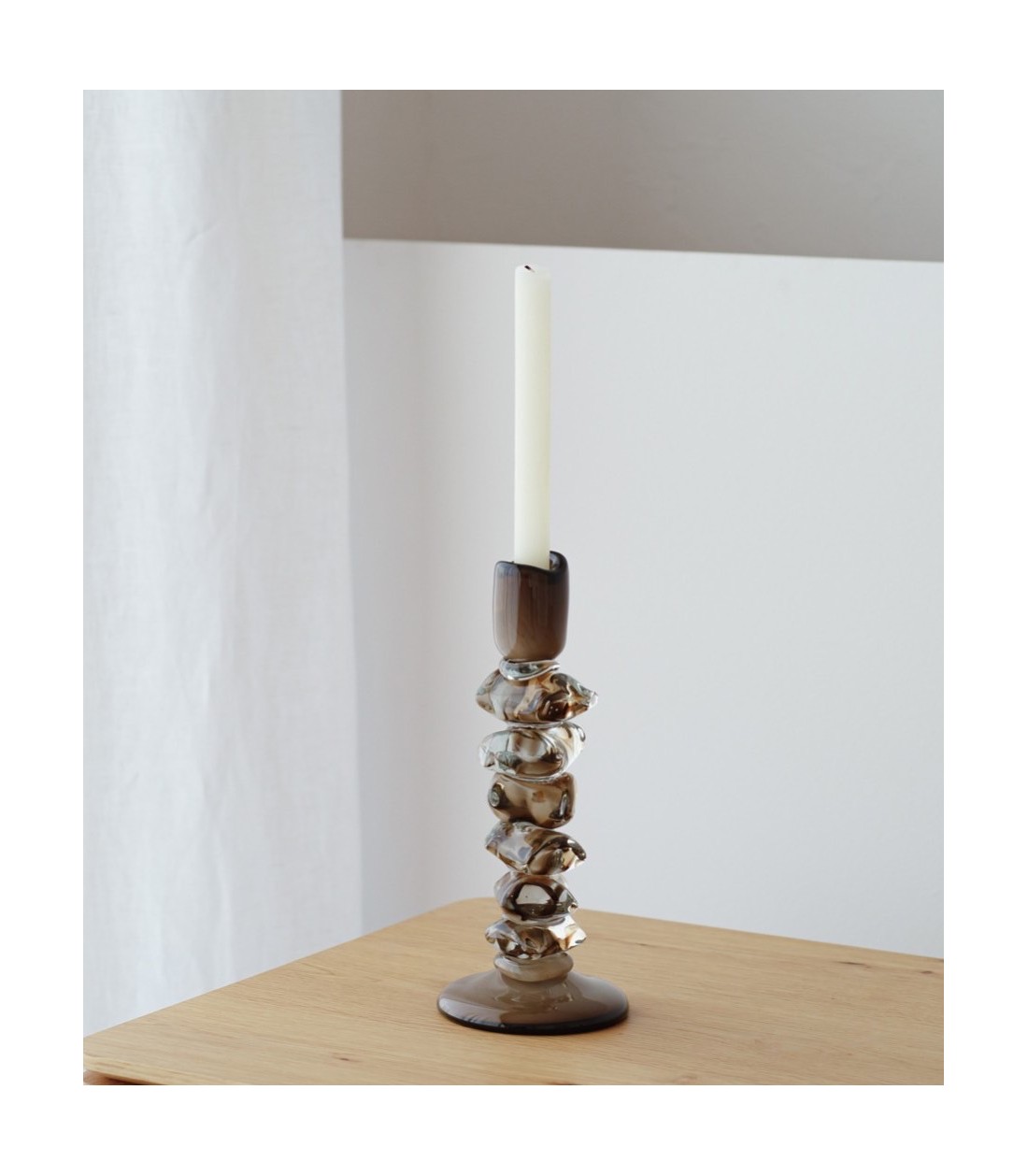 Candelabro Aldán en vidrio de color verde oliva con zonas transparentes, de forma irregular, que crea juegos de luces cálidos y acogedores al encender las velas.