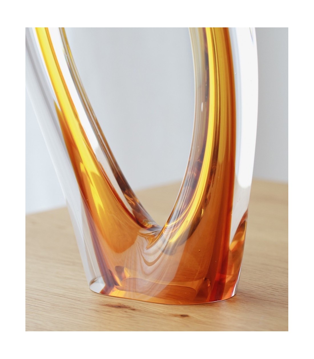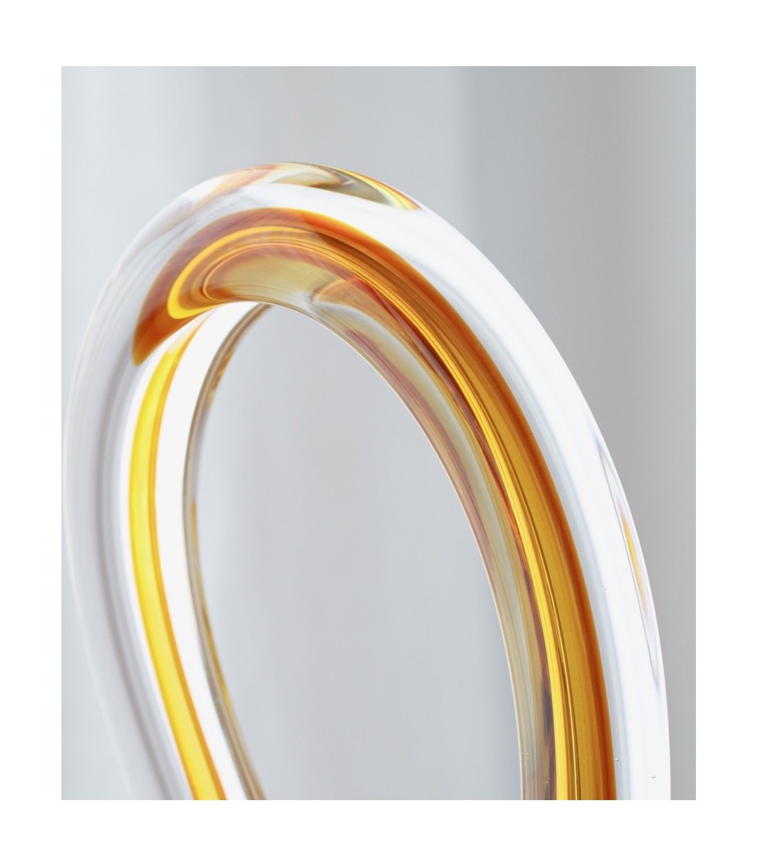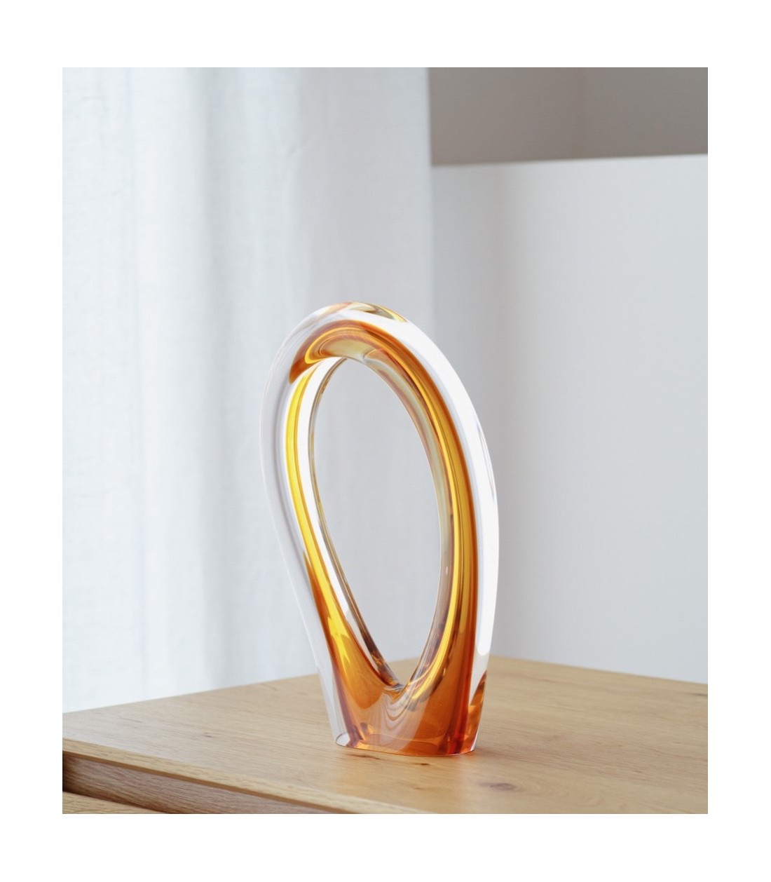 La pieza Naia está realizada en vidrio pulido coloreado, combinando un elegante tono ámbar en la zona central con áreas transparentes que generan un juego de luces único y dinámico. Sus líneas suaves y fluidas aportan armonía y ligereza, convirtiéndola en un elemento decorativo que transmite calidez y sofisticación. Perfecta para colocar sobre una mesa, un aparador o como detalle en una estantería, esta pieza se convierte en un recurso imprescindible para añadir un toque de diseño y estilo cuidado en cualquier espacio.