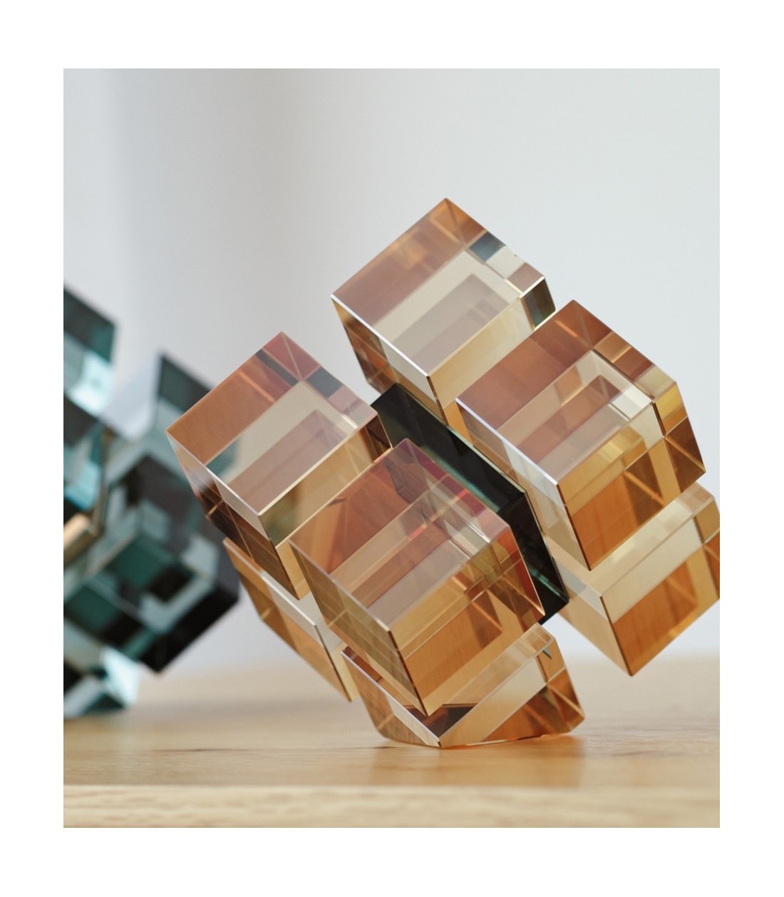 Escultura decorativa realizada en cristal pulido coloreado con un diseño geométrico moderno que combina elegancia y frescura. La pieza está compuesta por cuatro cubos en color champagne que se enlazan mediante una pieza central en vibrante tono turquesa, creando un contraste equilibrado y sofisticado. Gracias a su diseño lleno de luz y color, es perfecta para decorar mesas, estanterías o cualquier rincón del hogar u oficina, aportando un toque distintivo y contemporáneo. Se trata de una pieza versátil y llamativa que eleva la decoración con personalidad y estilo.