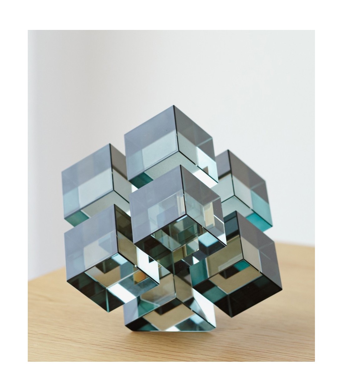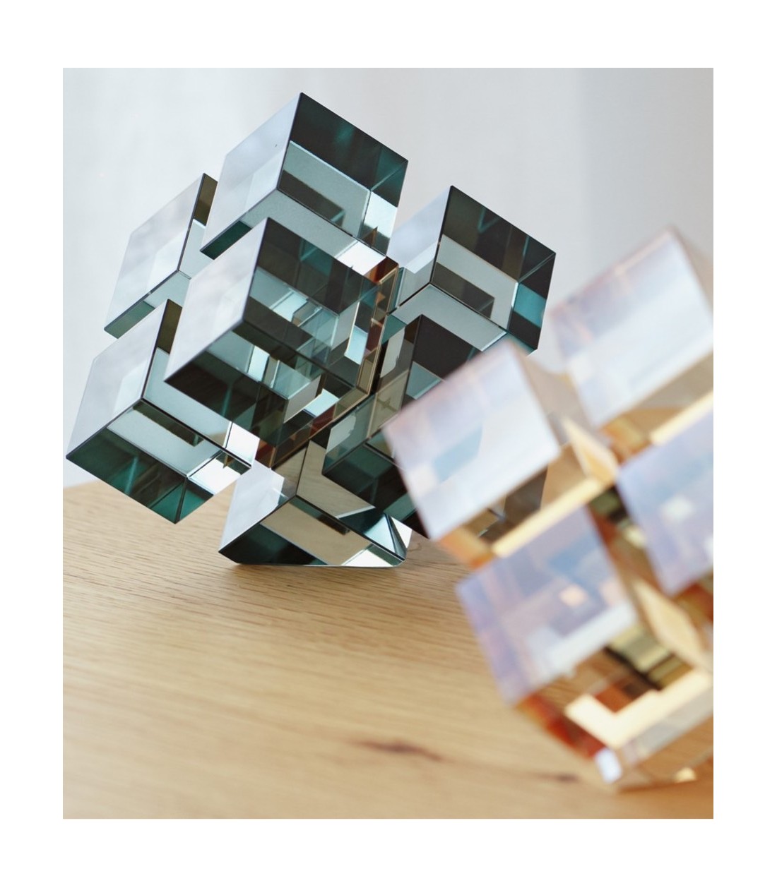 Escultura decorativa realizada en cristal pulido coloreado que destaca por su diseño geométrico y contemporáneo. La pieza está compuesta por cuatro cubos en color turquesa que se conectan a través de una pieza central en tono champagne, creando un contraste elegante y llamativo. Su diseño lleno de color y luminosidad la convierte en un elemento perfecto para aportar dinamismo y personalidad a cualquier estancia. Ideal para decorar mesas auxiliares, estanterías o consolas, esta pieza combina arte y funcionalidad, logrando un estilo sofisticado y actual en cualquier espacio.