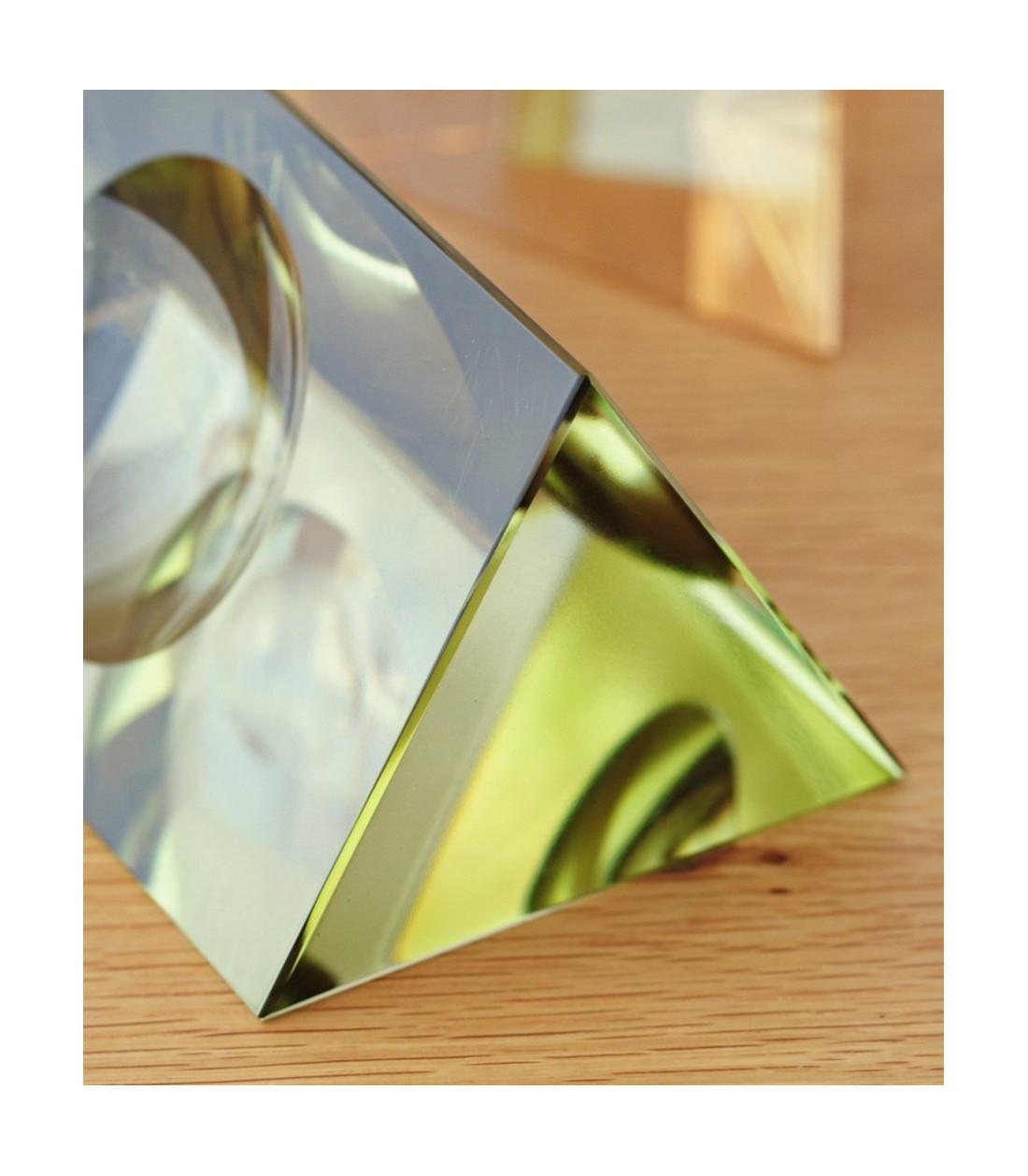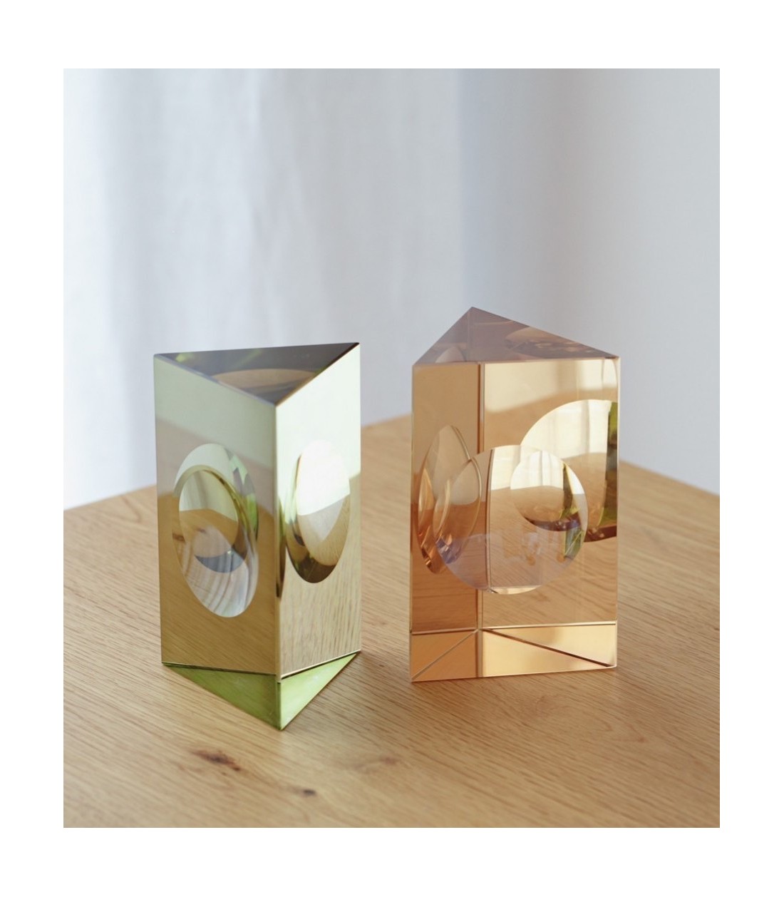 Set de 2 piezas decorativas en cristal pulido coloreado, con forma de prisma triangular y vacíos esféricos, en colores verde y champagne.