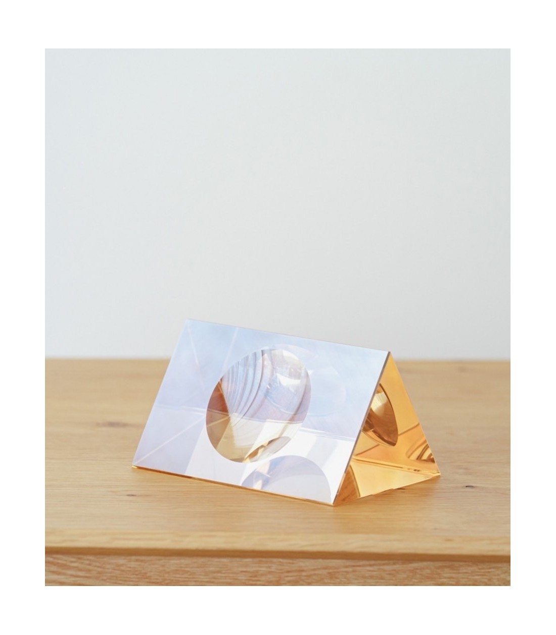 Este set decorativo está compuesto por dos piezas realizadas en cristal pulido coloreado con forma de prisma de base triangular. Sus lados presentan vacíos esféricos que generan un atractivo juego de luces y reflejos al incidir la luz sobre ellos. El conjunto combina una pieza en color verde y otra en tono champagne, aportando un contraste elegante y moderno que llena de estilo cualquier espacio. Gracias a su diseño original y a la fuerza visual del cristal, se convierten en elementos versátiles ideales para decorar consolas, estanterías, mesas auxiliares o rincones especiales, añadiendo un toque sofisticado y contemporáneo.