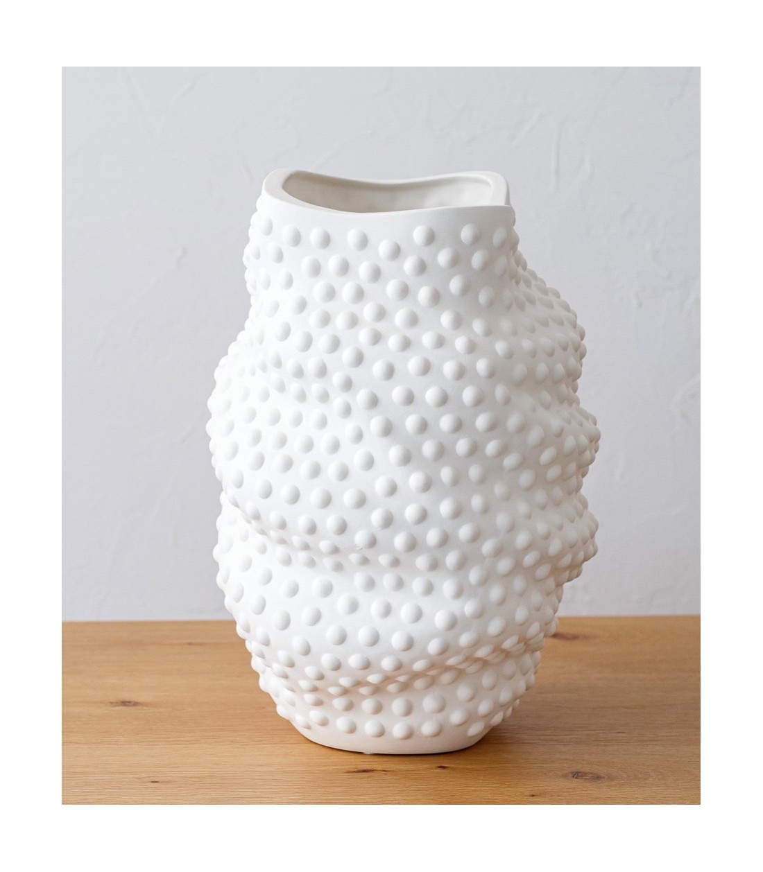 El jarrón de la colección Soia está realizado en cerámica con un elegante acabado natural mate, elaborado artesanalmente y cocido a alta temperatura para garantizar resistencia, durabilidad y realzar la pureza de su acabado. Su diseño se distingue por la superficie completamente cubierta de pequeñas semiesferas en relieve, un detalle distintivo que aporta textura, personalidad y un gran valor estético. Con su elegancia escultórica y carácter contemporáneo, se convierte en un punto focal ideal para enriquecer proyectos de interiorismo, diseño de autor o espacios contract. Una colección exclusiva y artesanal perfecta para quienes buscan piezas con fuerza visual y un estilo único.
