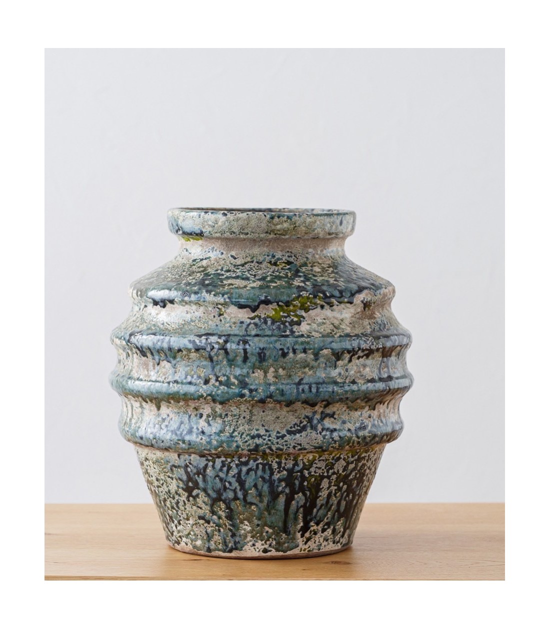 La vasija de la colección Celtia, en tamaño grande, presenta una forma ligeramente cónica con base ancha que se afina hacia la boca, destacando sus líneas horizontales en relieve que aportan textura y volumen a la pieza. Su superficie combina un acabado rugoso y vidriado en tonos verdes, grises y beige con sutiles reflejos metálicos, dejando parte de la pasta cerámica sin vidriar para realzar su carácter artesanal. Esta colección fusiona lo tradicional con técnicas modernas de esmaltado, creando piezas que destacan por su singularidad y estilo. Perfecta para espacios que buscan un elemento decorativo con personalidad, cada vasija Celtia es única gracias a las variaciones propias de su proceso artesanal.