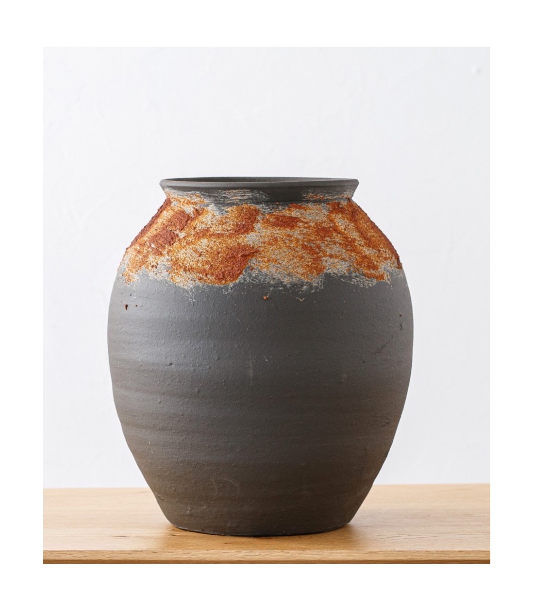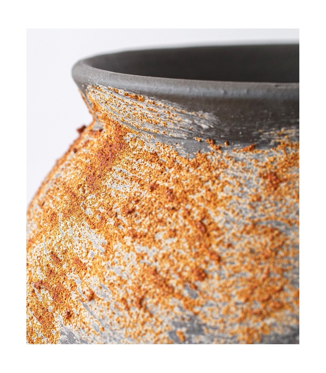 Vasija Ferro grande en cerámica, de diseño rústico y contemporáneo, con acabado mate negro y texturas oxidadas en tonos cálidos que aportan carácter único.