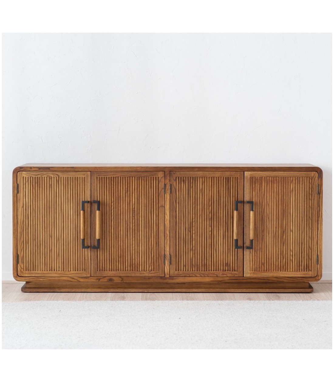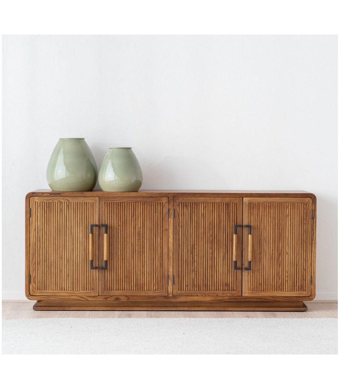 Aparador Herea en contrachapado de fresno natural con patas de madera maciza, cuatro puertas con baldas interiores y puertas acanaladas con tiradores metálicos en negro mate y detalle en fresno, de diseño cálido y elegante.