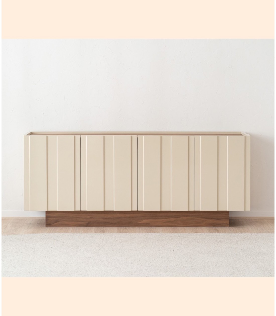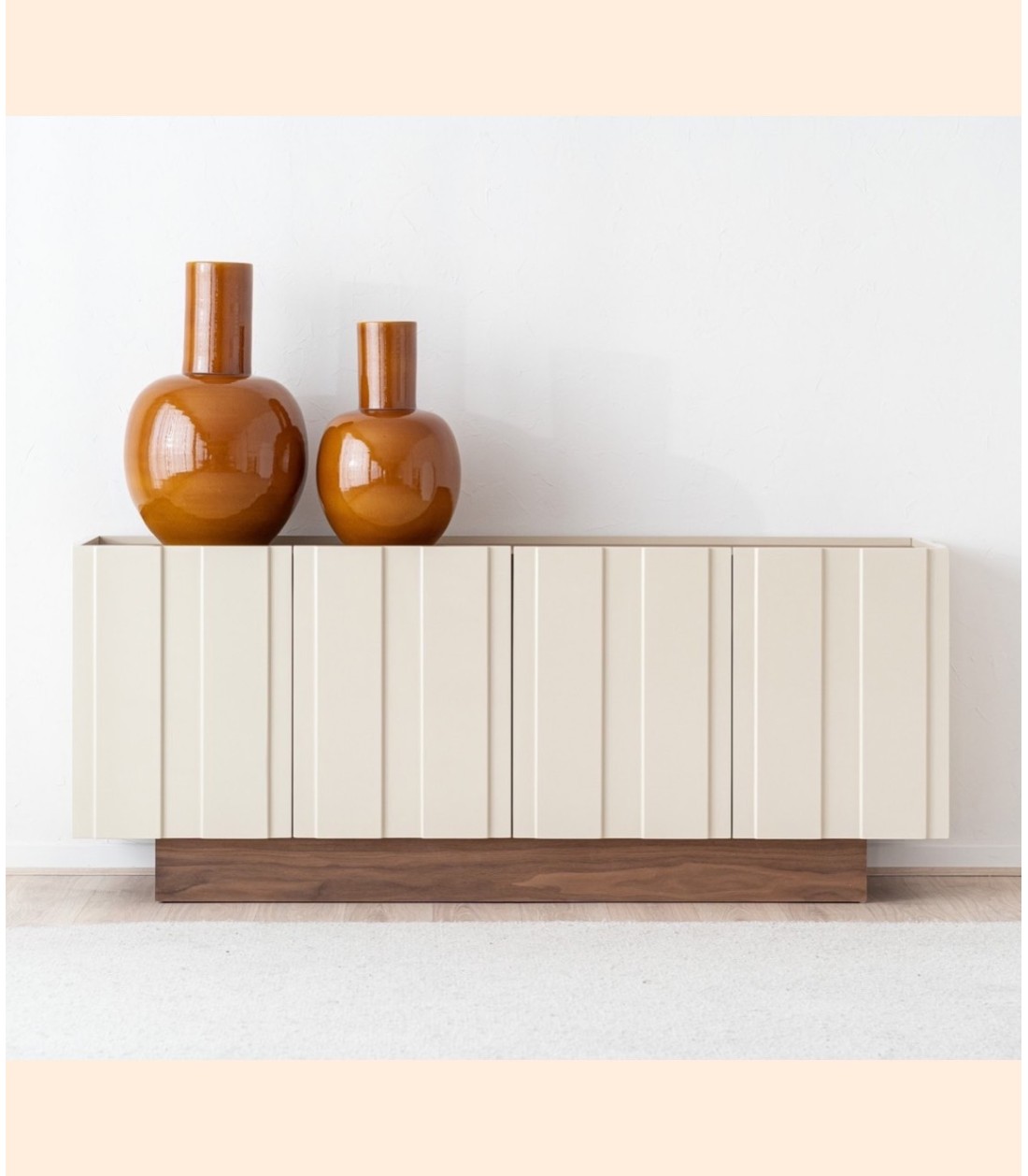 Aparador lacado en alto brillo color beige suave con sobre y base en chapa de nogal, diseño contemporáneo con relieve en paños verticales, 4 puertas y 4 baldas interiores, combinación de calidez y estética actual.