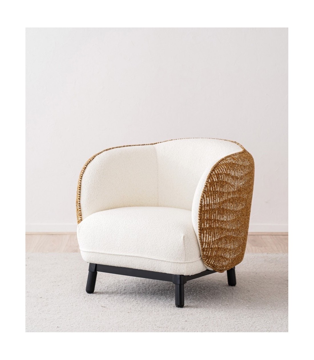 Butaca de líneas curvas de estilo contemporáneo con doble tapizado en tonos blanco roto y ocres, patas redondeadas de madera de roble en acabado negro, ideal para ambientes sofisticados o naturales.