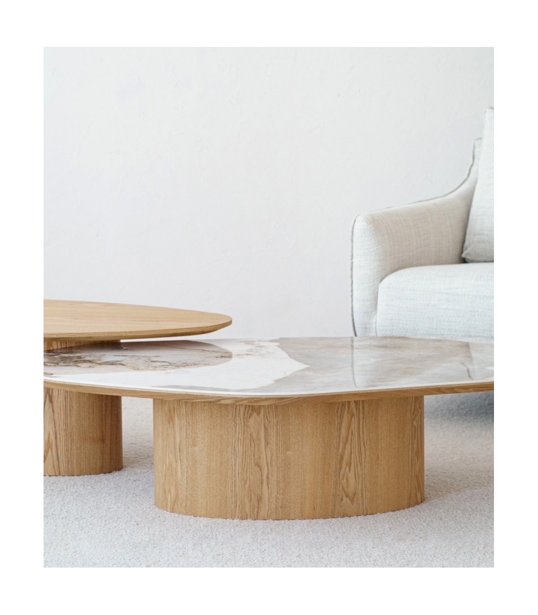 Mesa de centro de forma orgánica con sobre en cerámico blanco y ocre y base de fresno natural, un diseño ligero e irregular que combina perfectamente con otras piezas de madera para crear ambientes armónicos y cálidos.