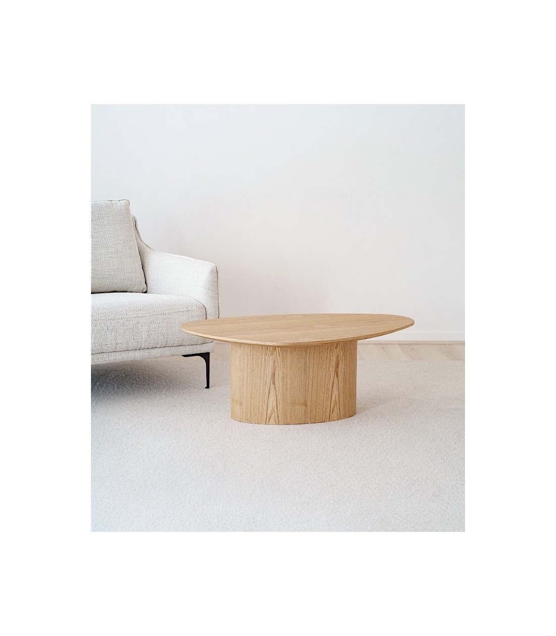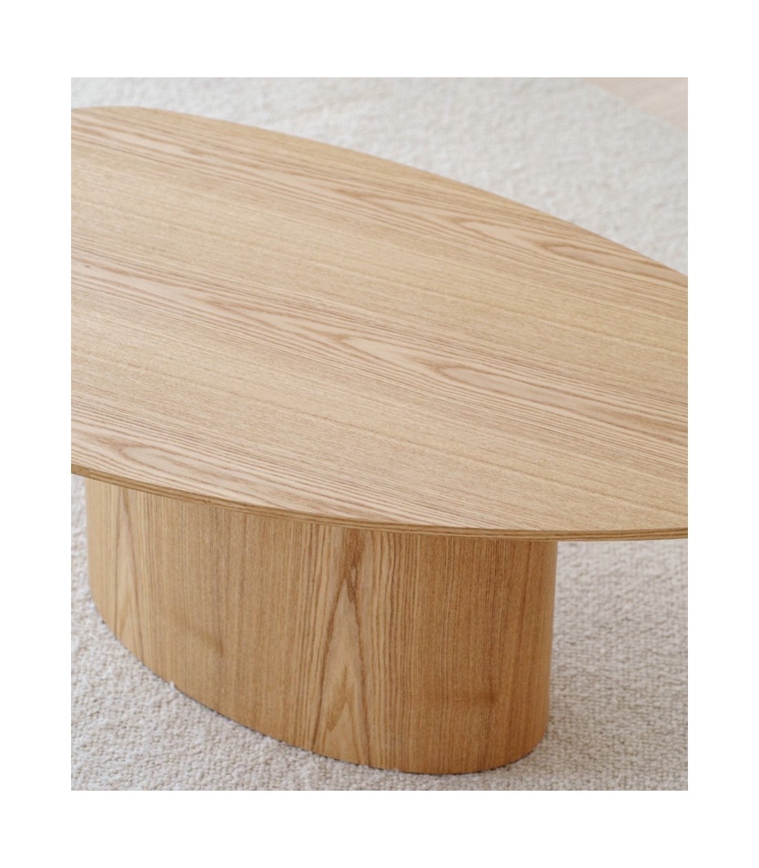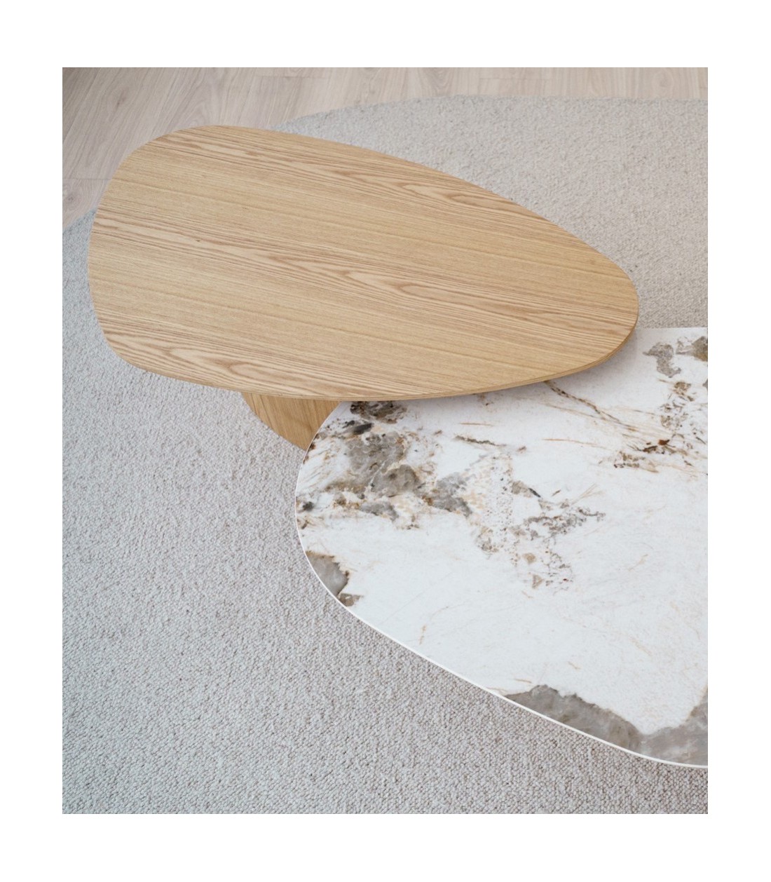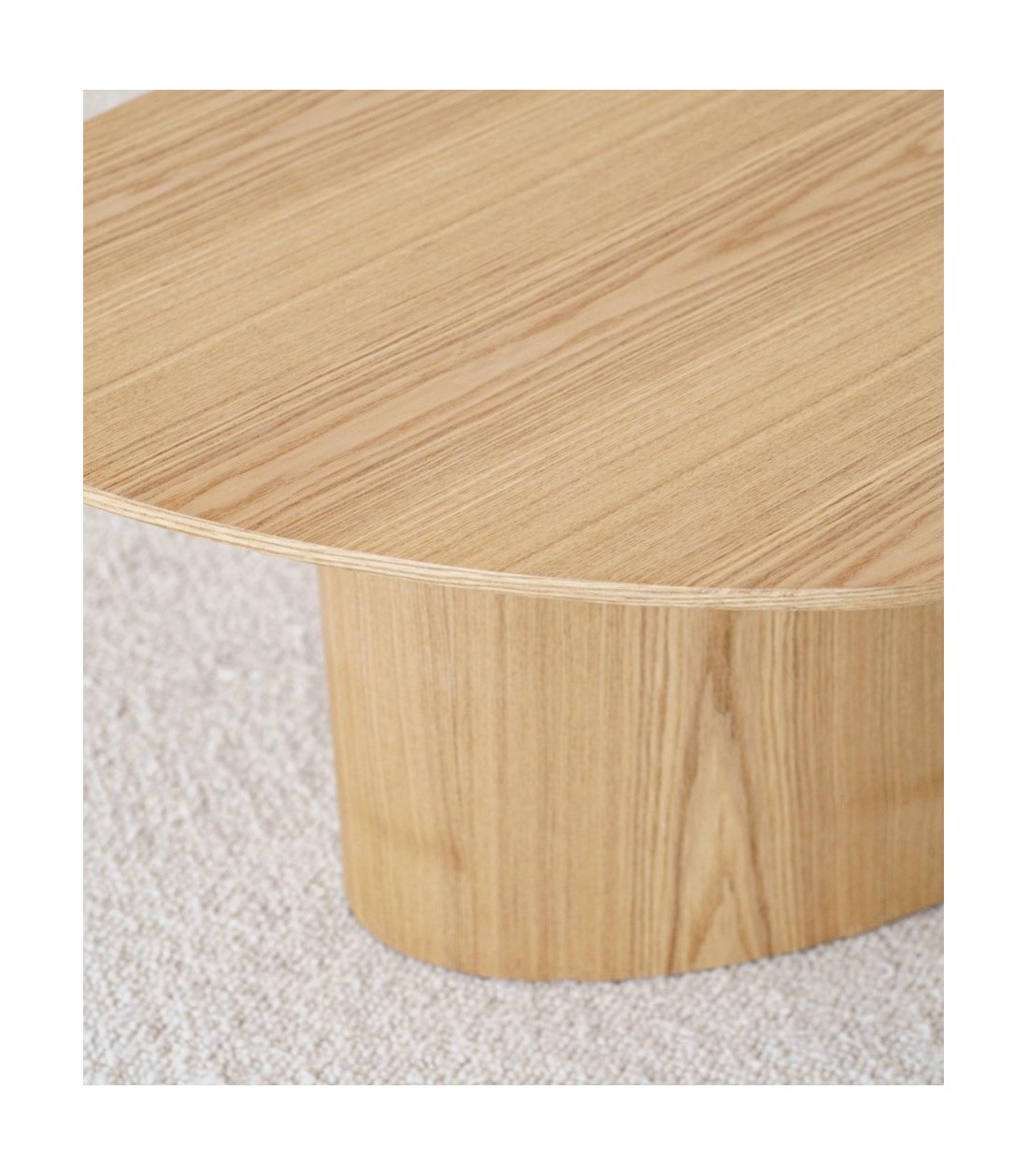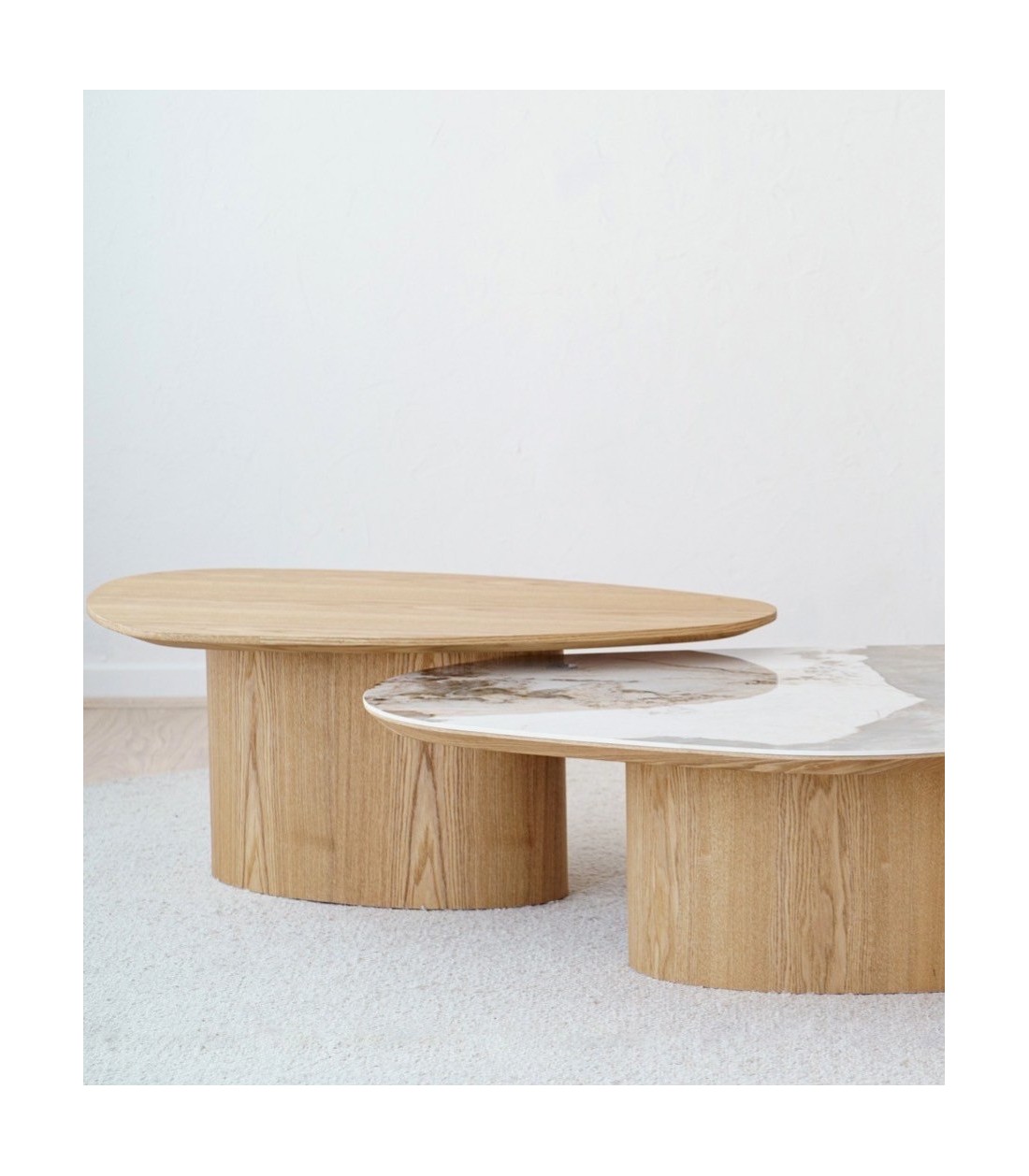 Mesa de centro de diseño orgánico realizada en MDF con chapa de fresno natural. Su tablero irregular se apoya sobre una base central en forma de óvalo, lo que le aporta una gran sensación de ligereza visual. El diseño está pensado para combinarse con una segunda mesa similar en acabado cerámico, creando un conjunto armónico y dinámico. Los tonos y vetas pueden variar entre piezas, acentuando su carácter único.