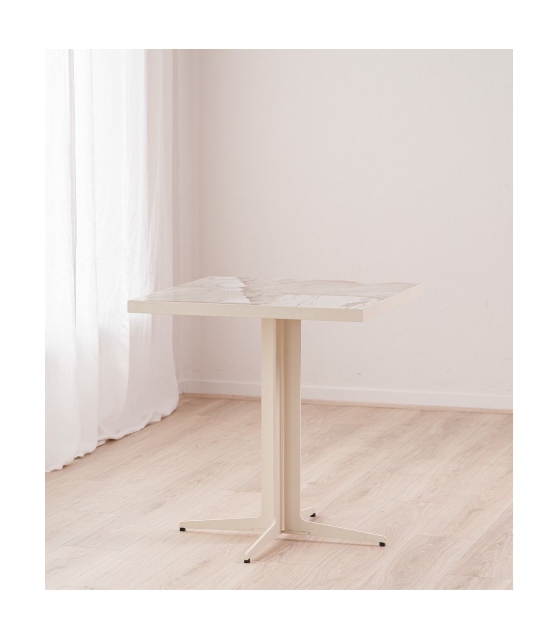 Mesa cuadrada de 70×70 cm y 75 cm de altura con sobre cerámico brillo en tonos blanco roto, gris y beige, base metálica trípode lacada en beige, ideal para hostelería y restauración por su diseño elegante, compacto y funcional.
