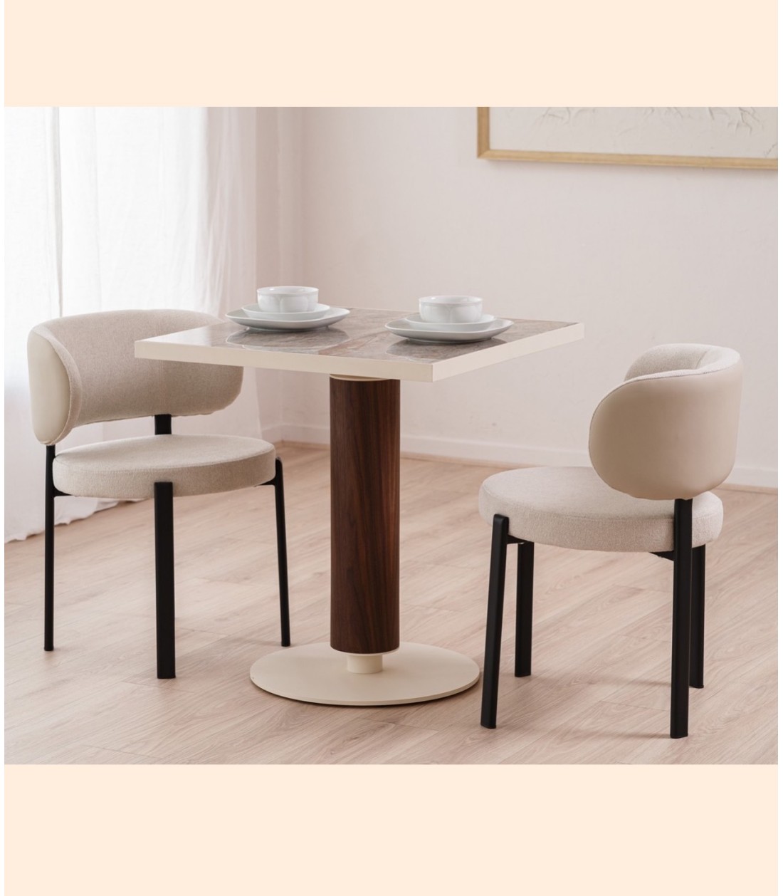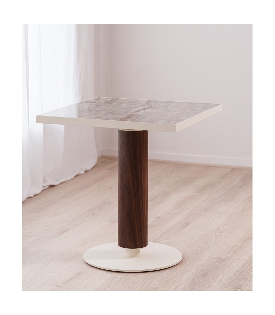 Mesa cuadrada de diseño compacto con sobre cerámico brillo en tonos gris y ocre sobre fondo gris piedra, base cilíndrica en chapa de nogal y metal lacado beige, que combina funcionalidad, durabilidad y elegancia contemporánea.