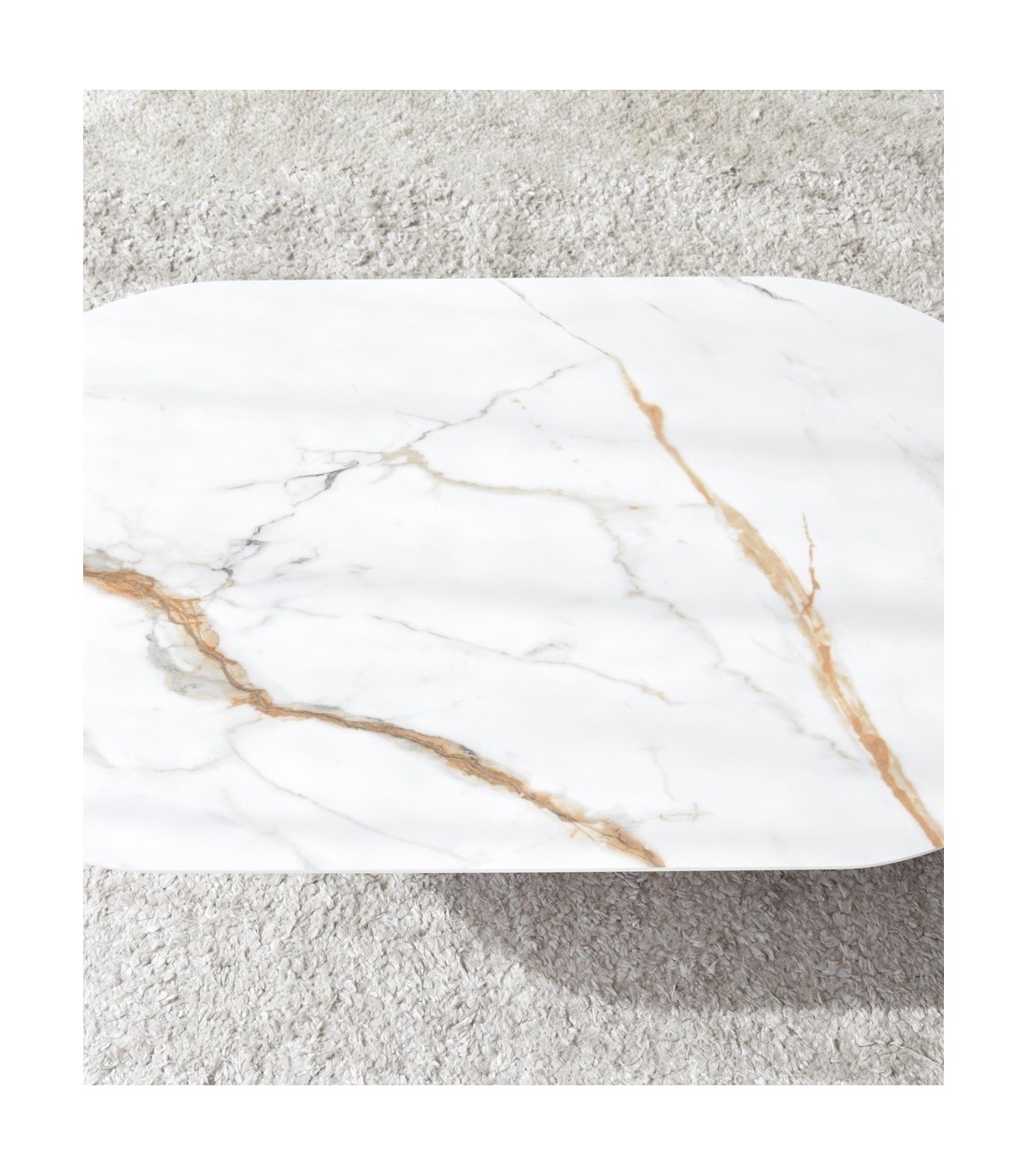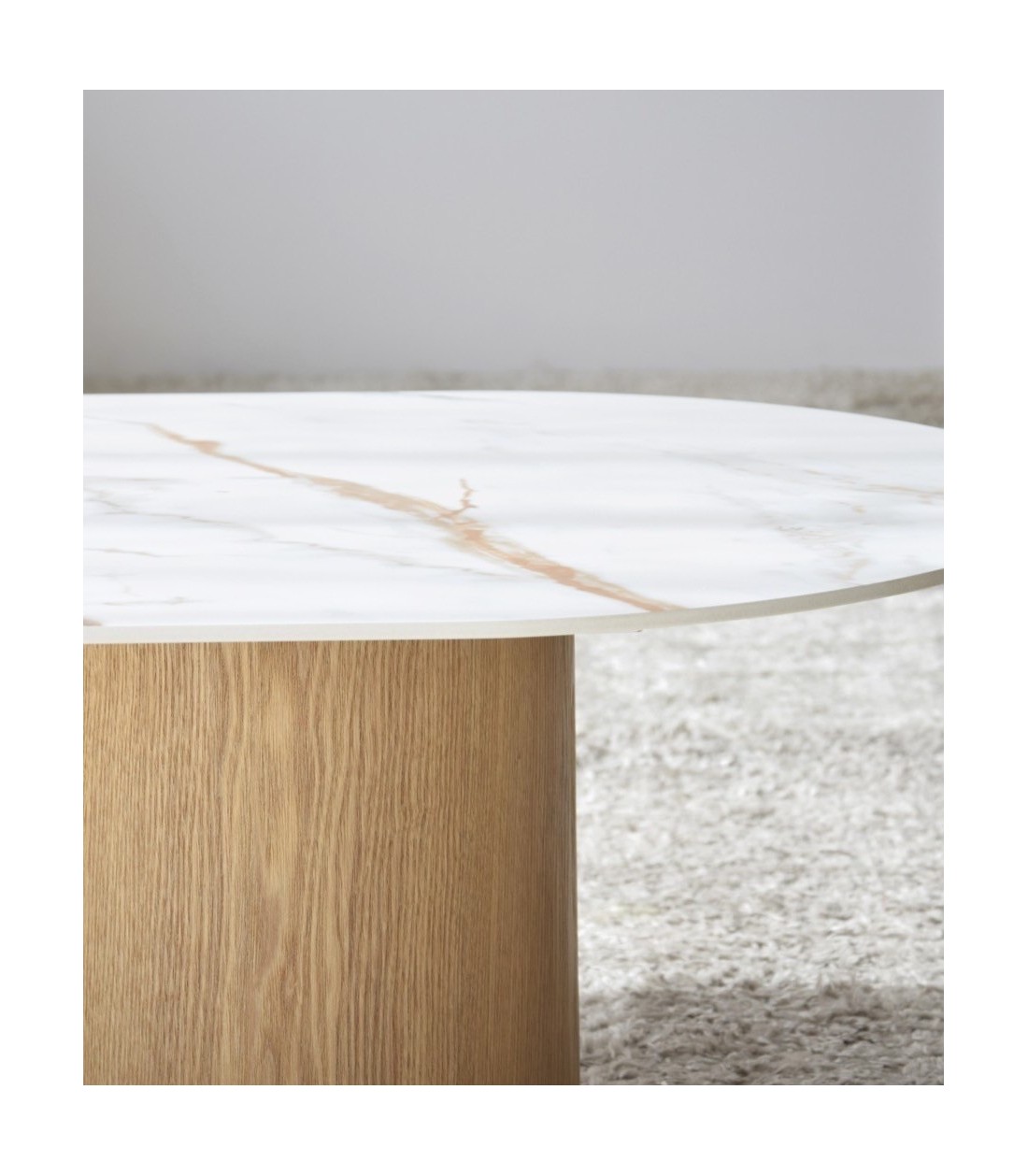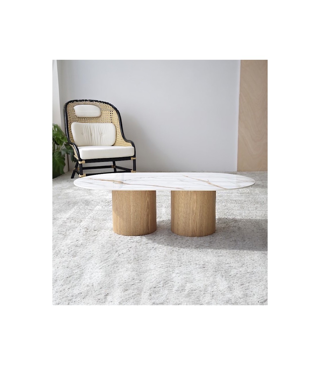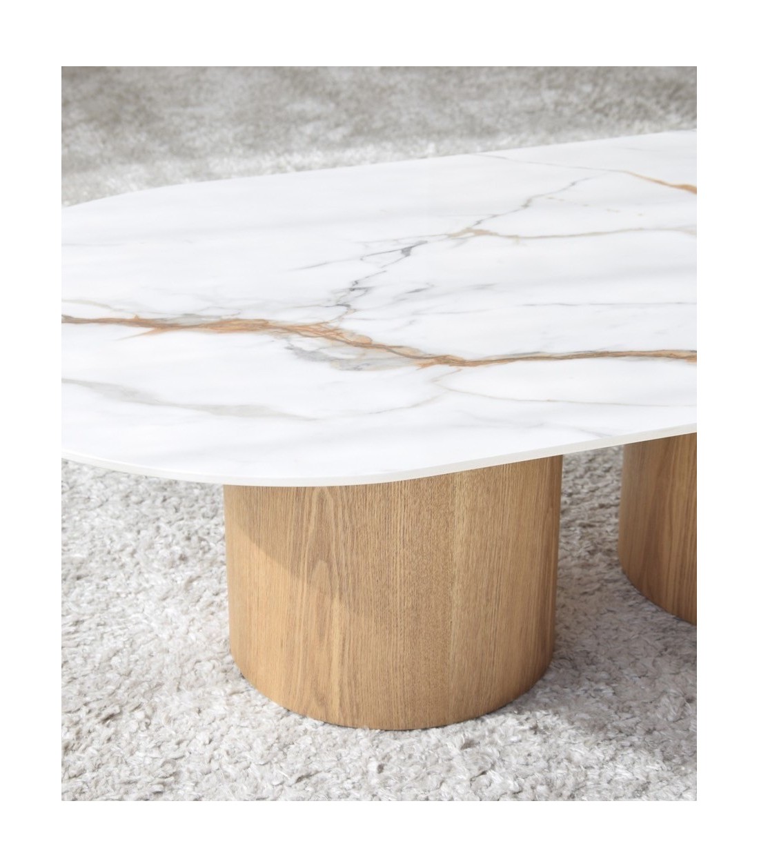 Mesa de centro con sobre semi-ovalado en piedra sinterizada efecto mármol blanco veteado, combinada con una base cilíndrica en madera de fresno natural para un estilo elegante y orgánico.