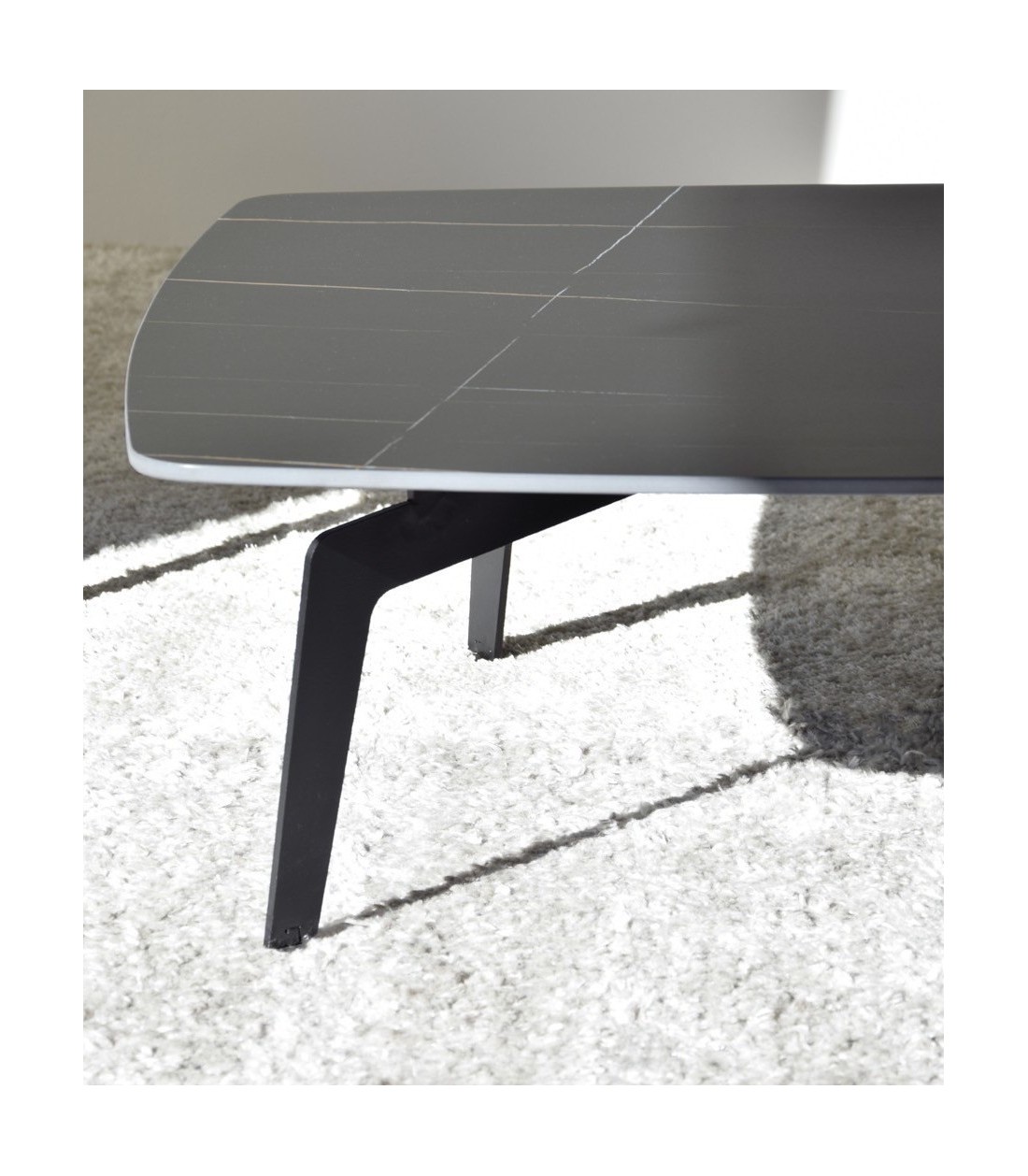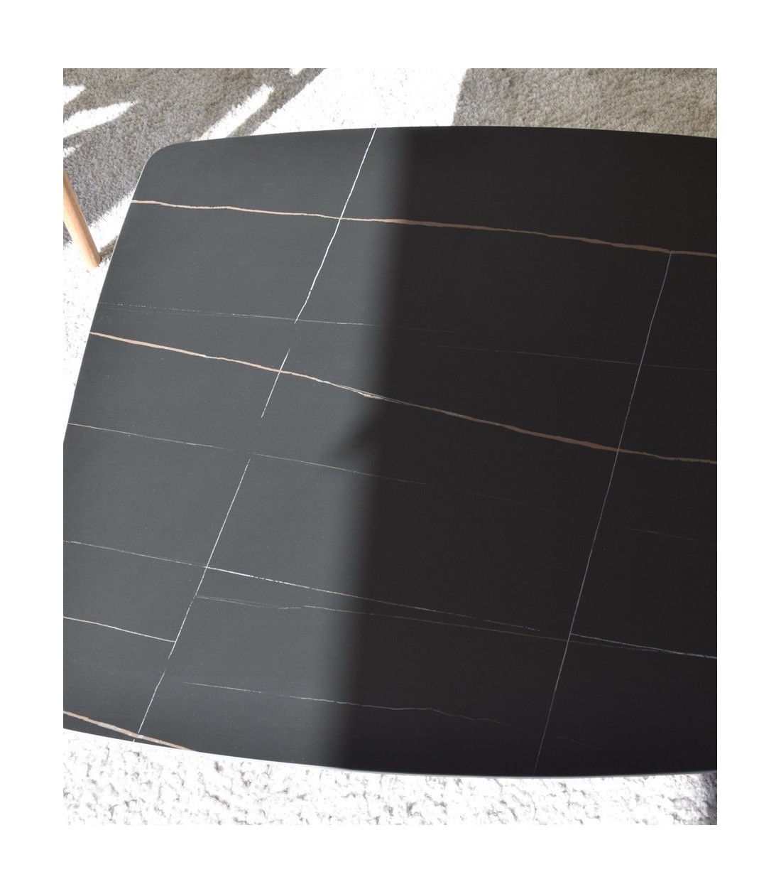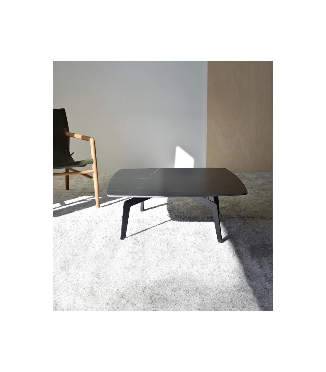 Mesa de centro cuadrada con estructura de metal negro y sobre en piedra sinterizada negra con vetas ocres, perfecta para ambientes modernos y sofisticados.