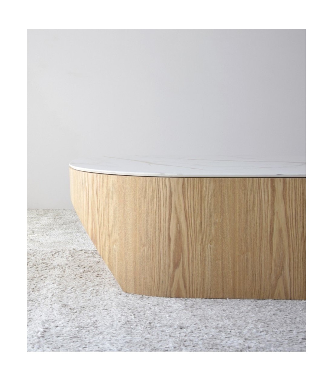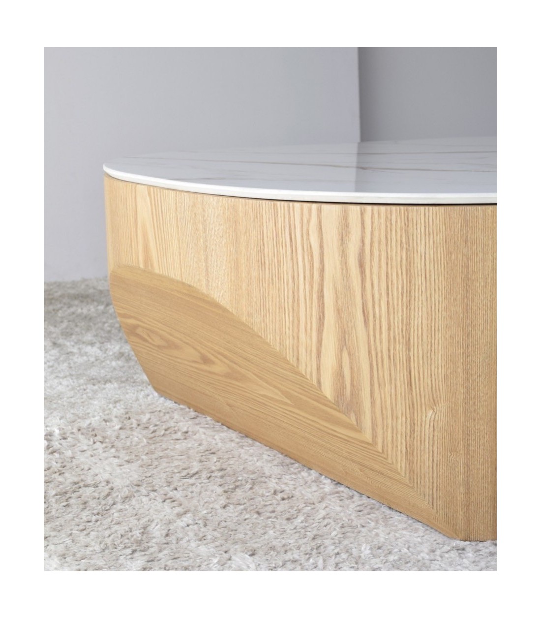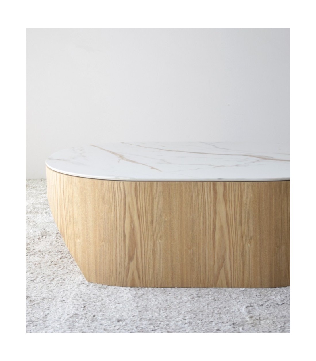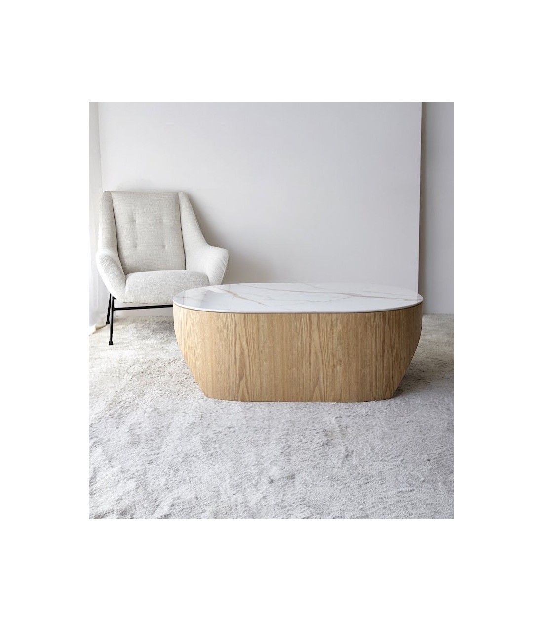 Mesa de centro Nora con sobre cerámico de 12 mm en acabado mármol blanco veteado en tonos ocres y grises. La base, de forma ovalada, está realizada en DM rechapado en fresno natural mate, con un diseño que aligera visualmente la pieza gracias a los arcos practicados en sus extremos. Los tonos y vetas del sobre pueden variar entre piezas.