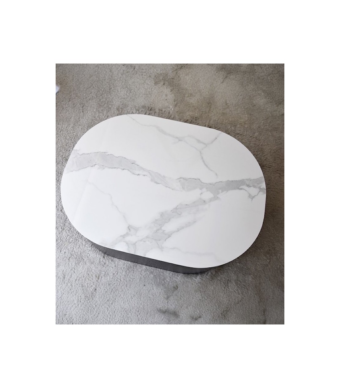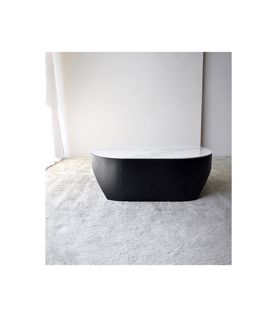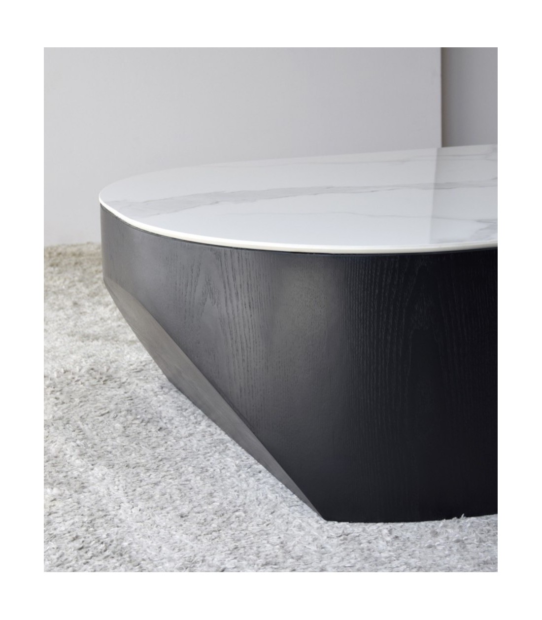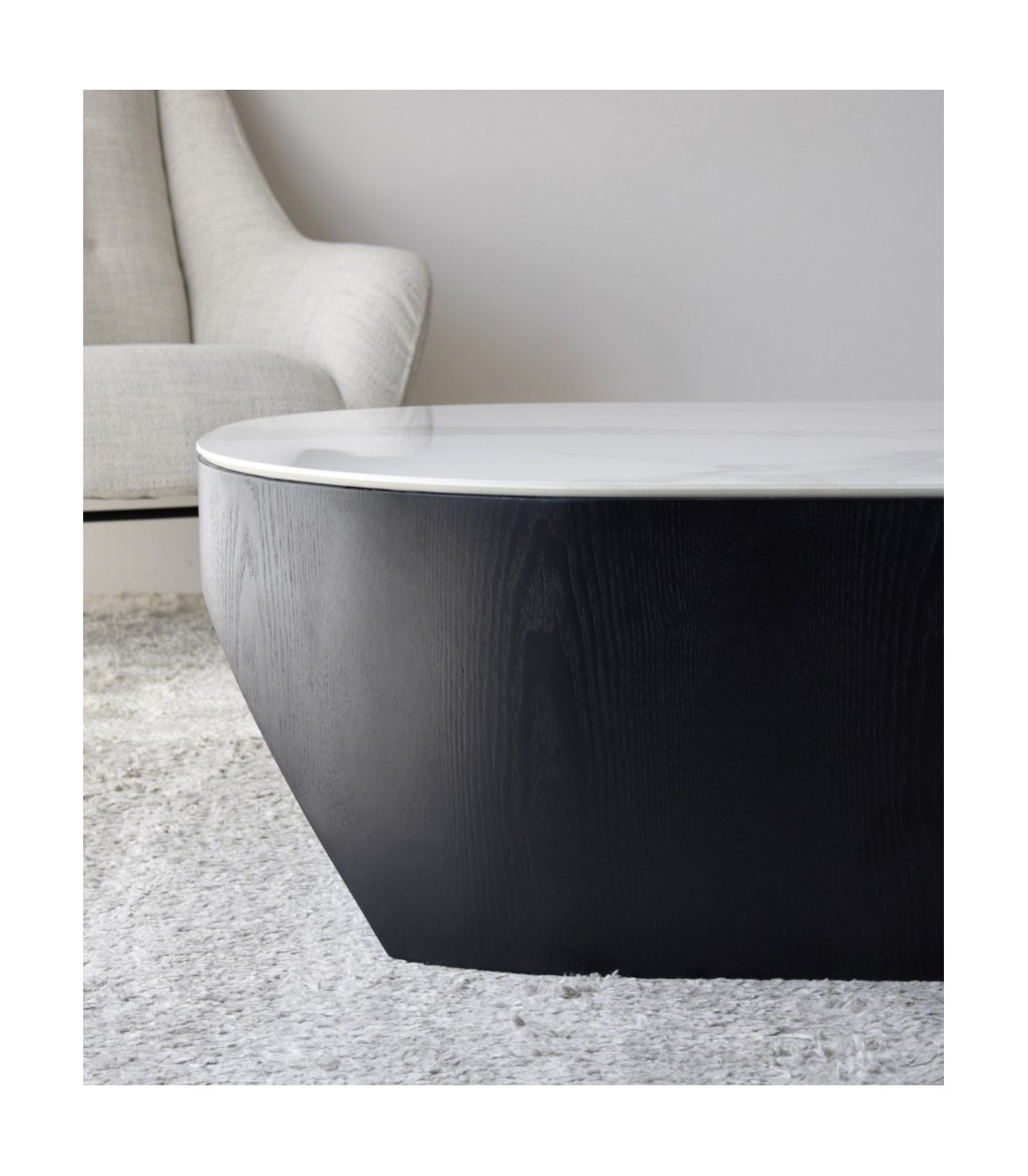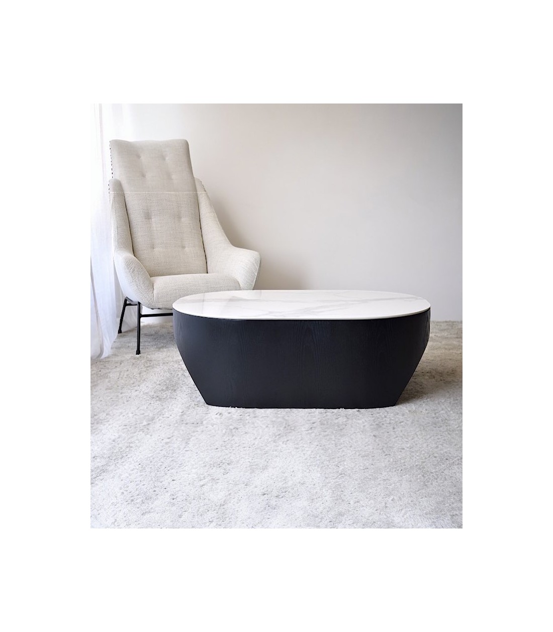 Mesa de centro Nora con sobre realizado en material cerámico de 12 mm de espesor de acabado mármol en color blanco vetado en tonos grises. La base está formada por una pieza maciza de forma ovalada aligerada por un rebaje practicado en los extremos en forma de arco, lo que aporta cierto movimiento a la pieza. Realizada en DM rechapado en fresno natural teñido en color negro de acabado mate. Los tonos y patrones del material utilizado en el sobre pueden ser diferentes de unas piezas a otras. Cerámico N1.