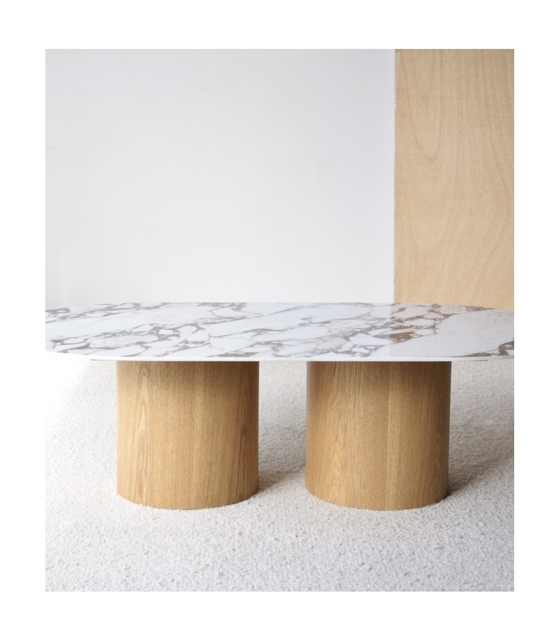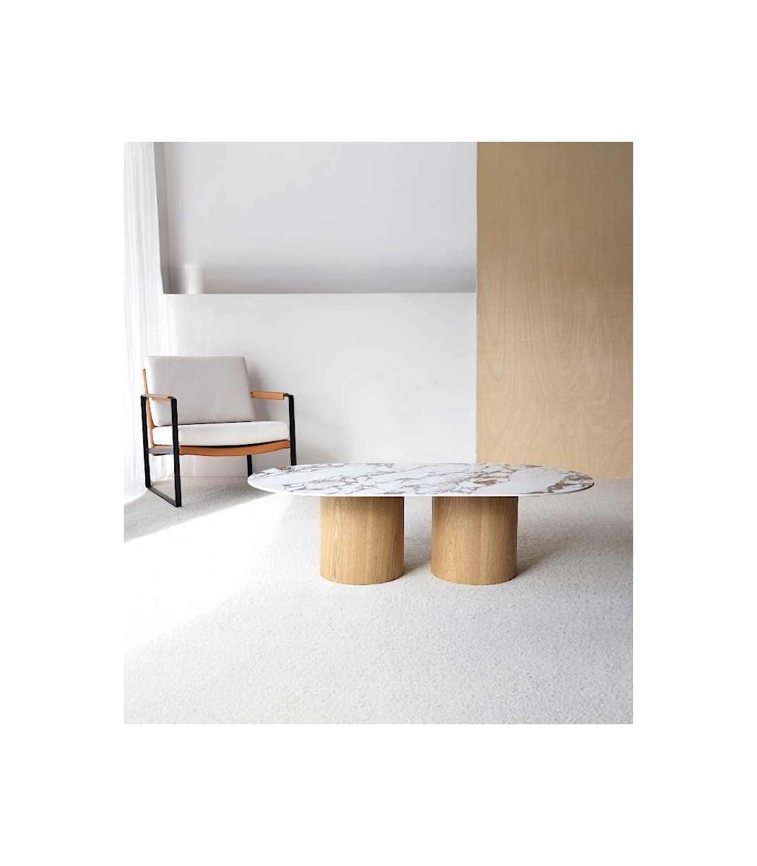 Mesa de centro con un diseño elegante y original, perfecta para ambientes modernos con un toque artístico. Su sobre de forma semi-ovalada está realizado en piedra sinterizada de 12 mm de espesor, con un acabado efecto mármol en color blanco veteado en tonos marrón violeta, lo que le confiere una presencia sofisticada y única. La base está compuesta por dos piezas cilíndricas de aspecto rotundo, elaboradas en DM rechapado en madera de fresno con un acabado natural que aporta calidez y equilibra la composición. Cada mesa es única gracias a las variaciones naturales en los tonos y patrones del material cerámico del sobre. Ideal como pieza central en salones con estilo propio.