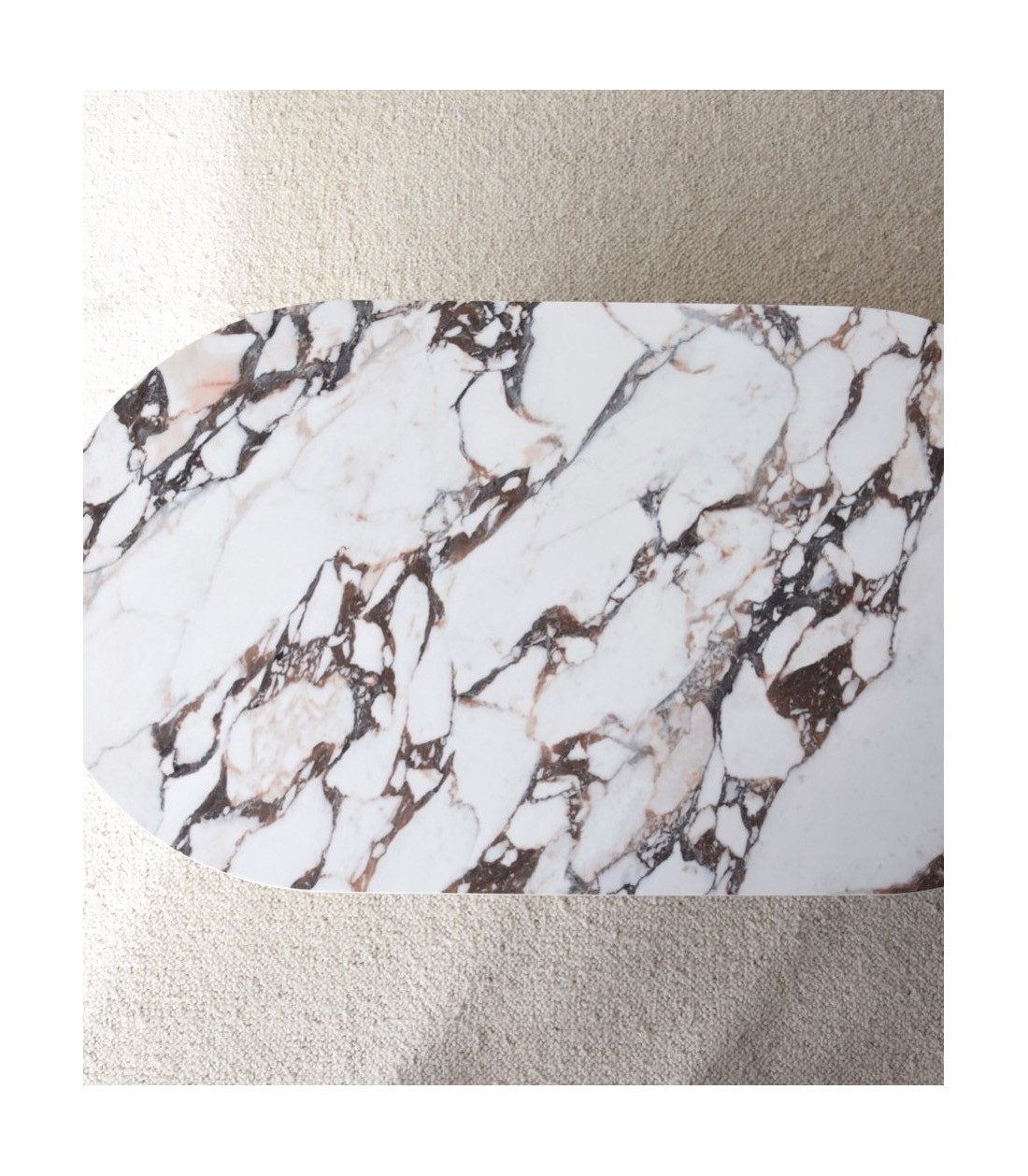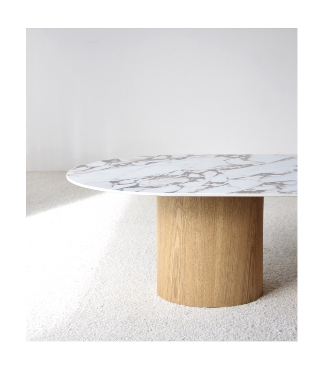 Mesa de centro con sobre semi-ovalado en piedra sinterizada efecto mármol blanco veteado en marrón violeta, combinada con base cilíndrica en madera de fresno natural para un toque exclusivo y sofisticado.