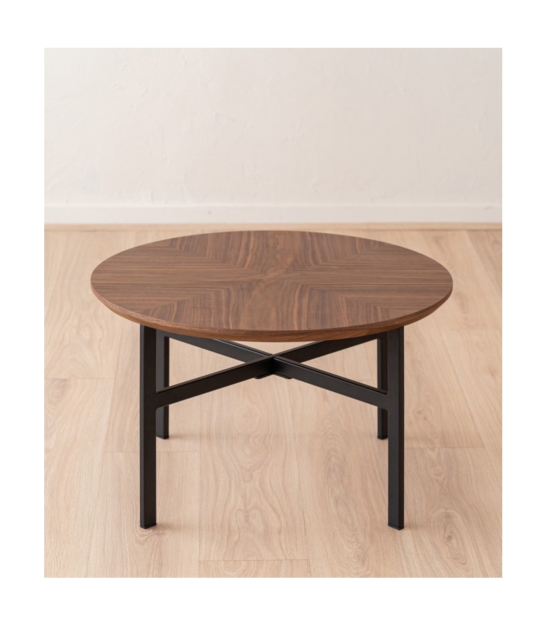 Mesa de centro redonda con tablero de nogal en patrón radial y patas en metal negro mate. Una pieza elegante y versátil que forma parte de un conjunto de tres mesas combinadas en distintos materiales y alturas.