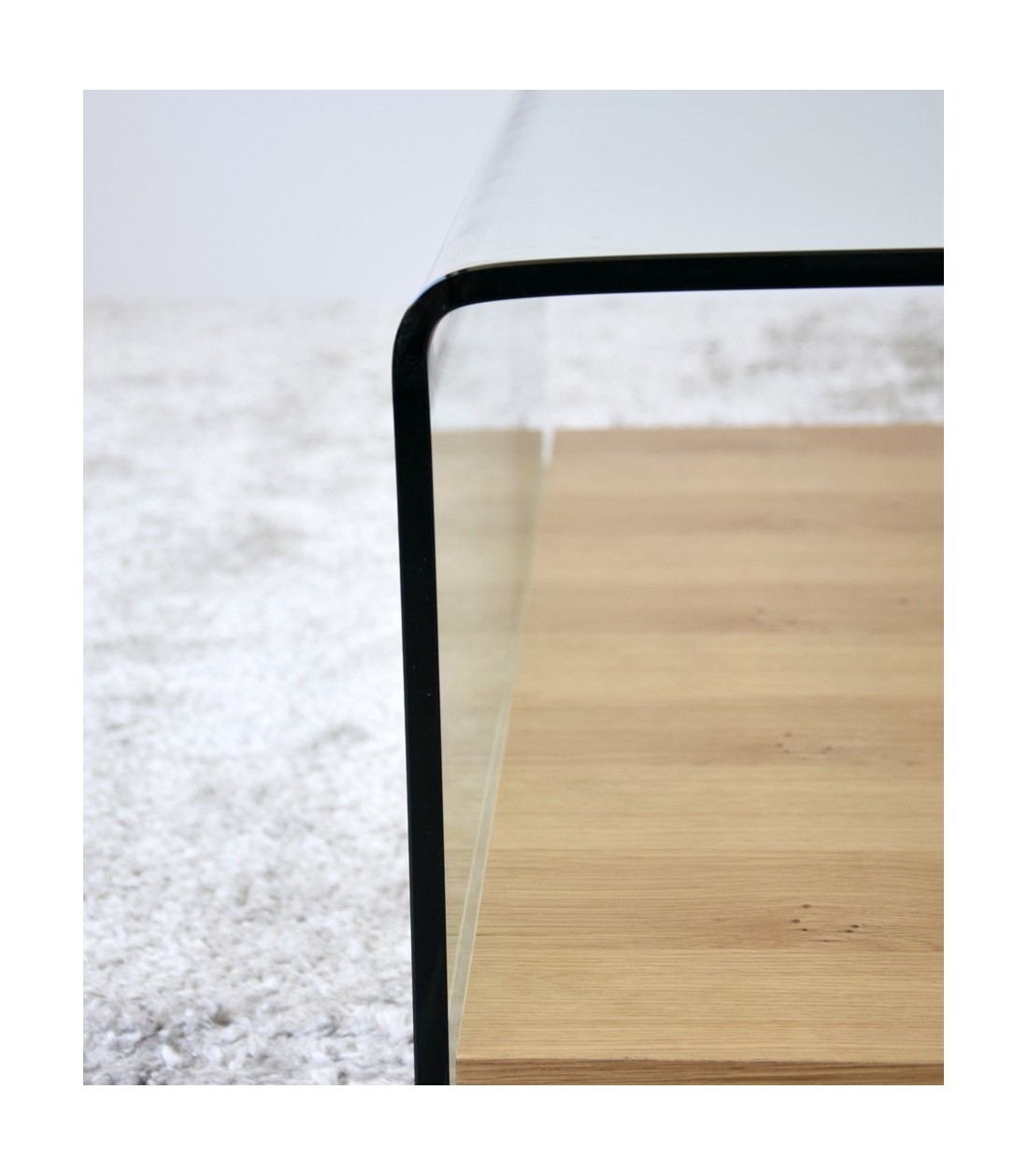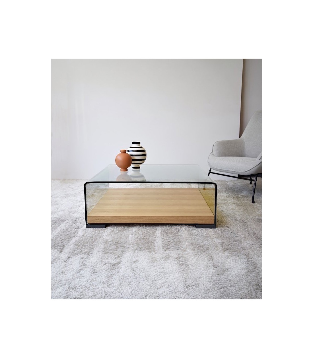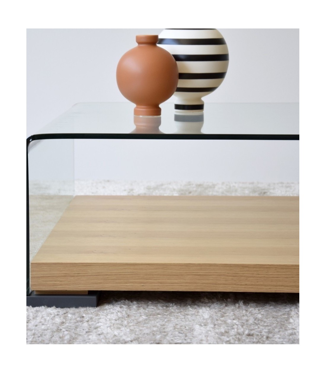 Mesa de centro cuadrada de diseño moderno en vidrio templado curvado con balda inferior en roble natural mate y patas metálicas en color grafito, ideal para interiores elegantes y funcionales.